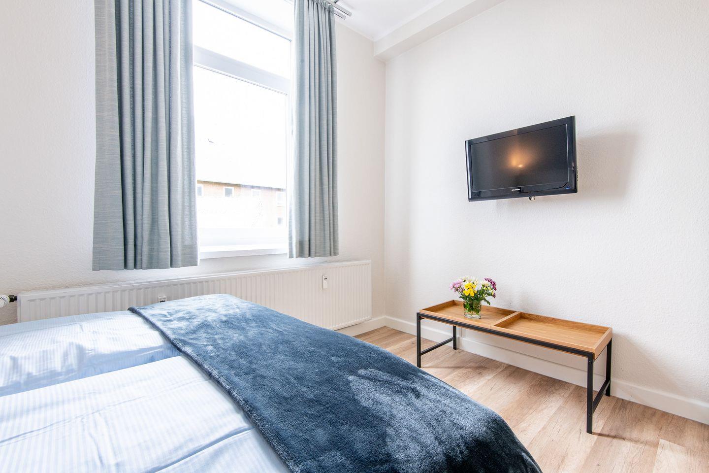 Beide Schlafzimmer verfügen jeweils über ein Doppelbett (je 2x80x200 cm), in einem Schlafzimmer befindet sich ein weiteres TV-Gerät