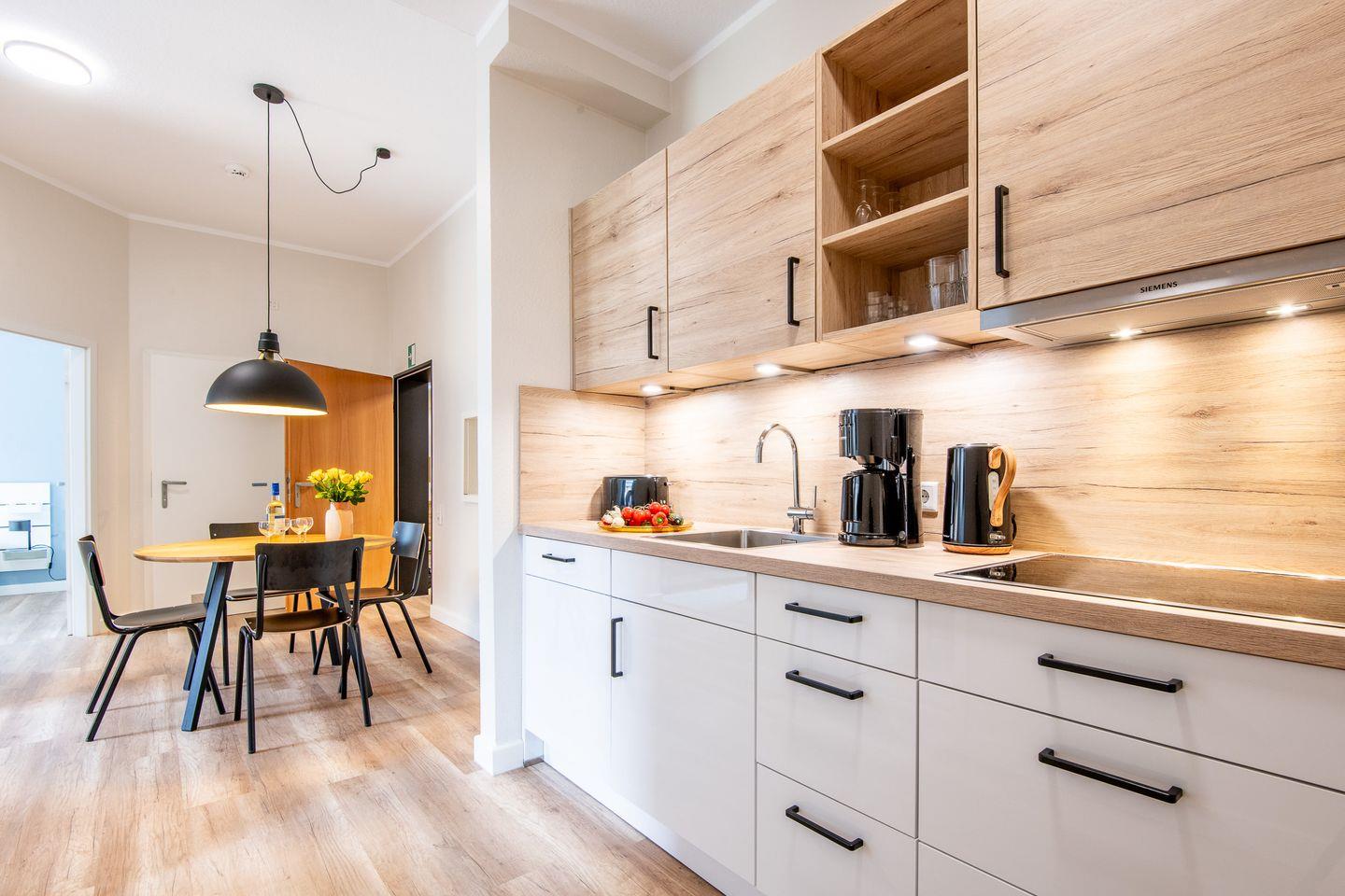 Der Essbereich mit Küchenzeile befindet sich im Eingangsbereich der Wohnung. Von hier aus gelangen Sie in den Wohnbereich, zur Terrasse, den Schlafzimmern und ins Bad mit ebenerdiger Dusche und Handtuchheizkörper.