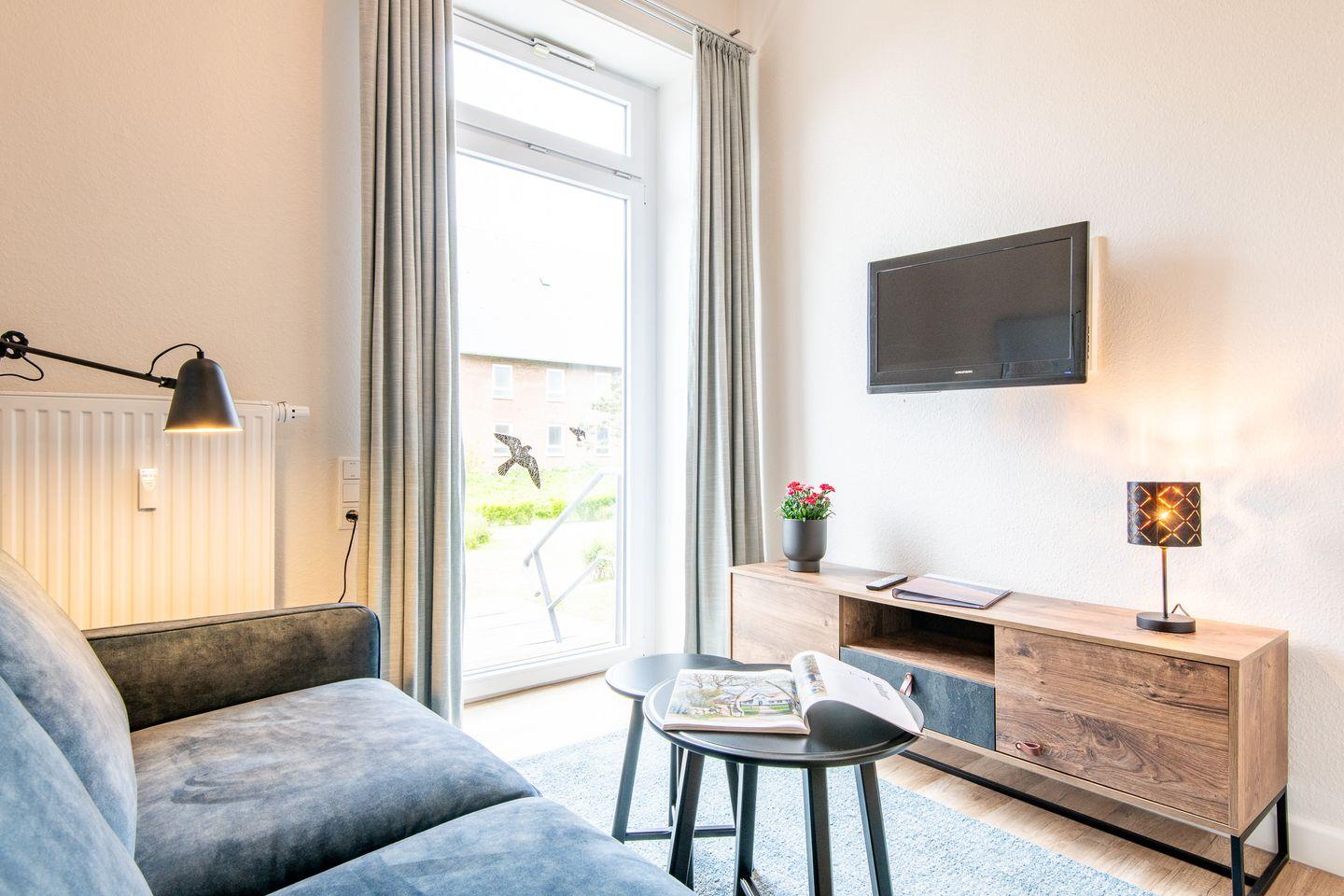 Der Wohnbereich lädt mit Sofa, Sessel und Fernsehgerät zum Verweilen ein.