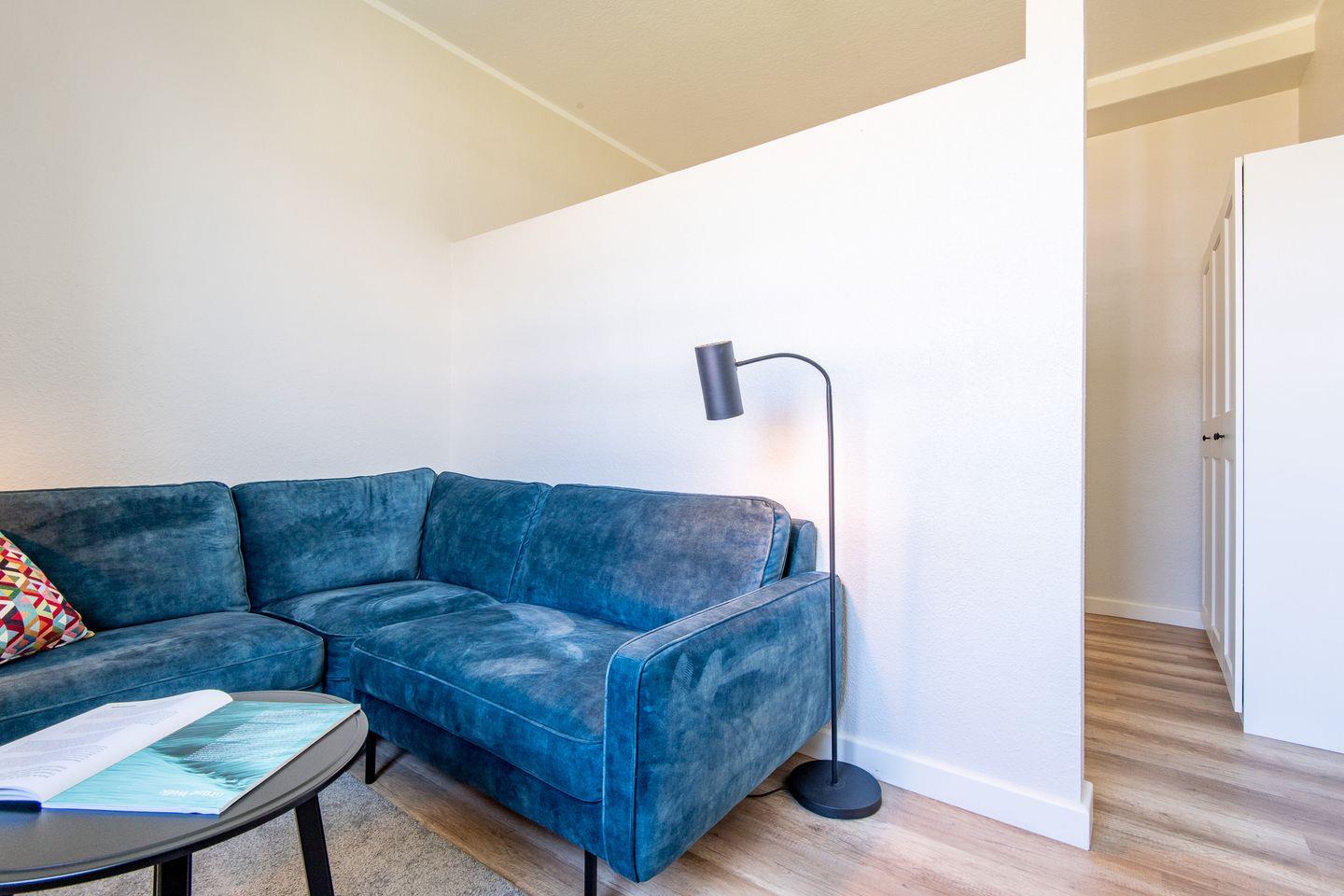 Der Wohn-Schlafbereich ist mit einer gemütlichen Sofaecke sowie einem TV-Gerät ausgestattet. Der Schlafbereich ist durch eine Wand vom Wohnbereich getrennt und mit einem bequemen Doppelbett und einem Kleiderschrank möbliert.