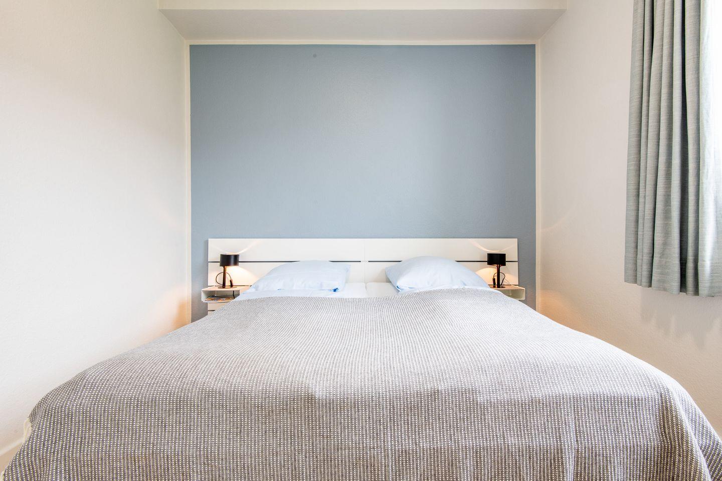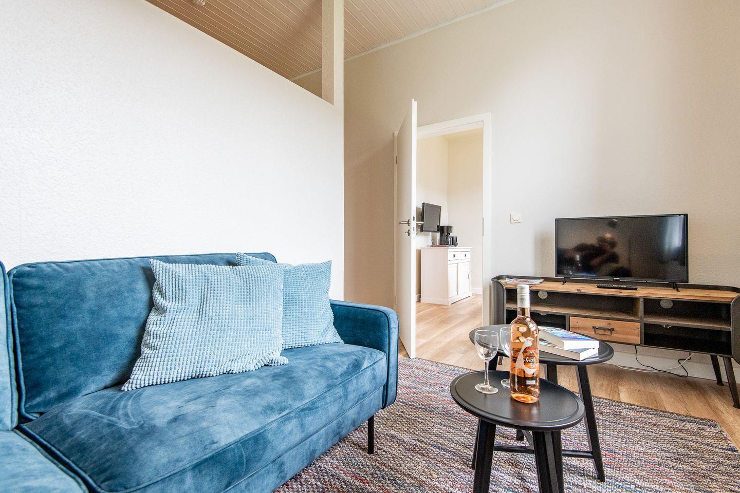 Der Wohn-Schlafbereich ist mit einer gemütlichen Sofaecke sowie einem TV-Gerät ausgestattet. Der Schlafbereich ist durch eine Wand vom Wohnbereich getrennt und mit einem bequemen Doppelbett und einem Kleiderschrank möbliert.