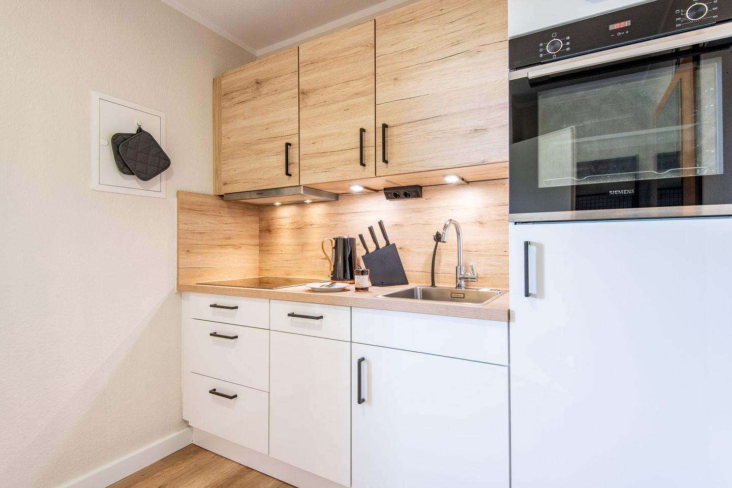 Die Küchenzeile befindet sich im Eingangsbereich der Wohnung. Sie ist mit allem nötigen wie Herd, Backofen, Spülmaschine, Kaffeemaschine, Wasserkocher und Toaster, sowie Kochutensilien und Besteck bestückt.
