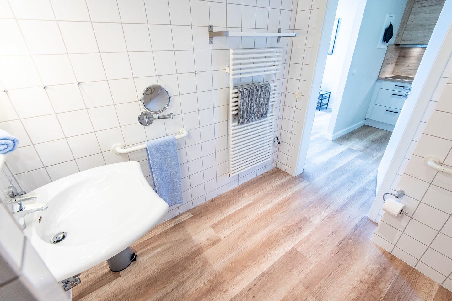 Das Badezimmer ist mit einer bodengleichen Dusche, einem Waschbecken, einem WC und einer Handtuchheizung ausgestattet.