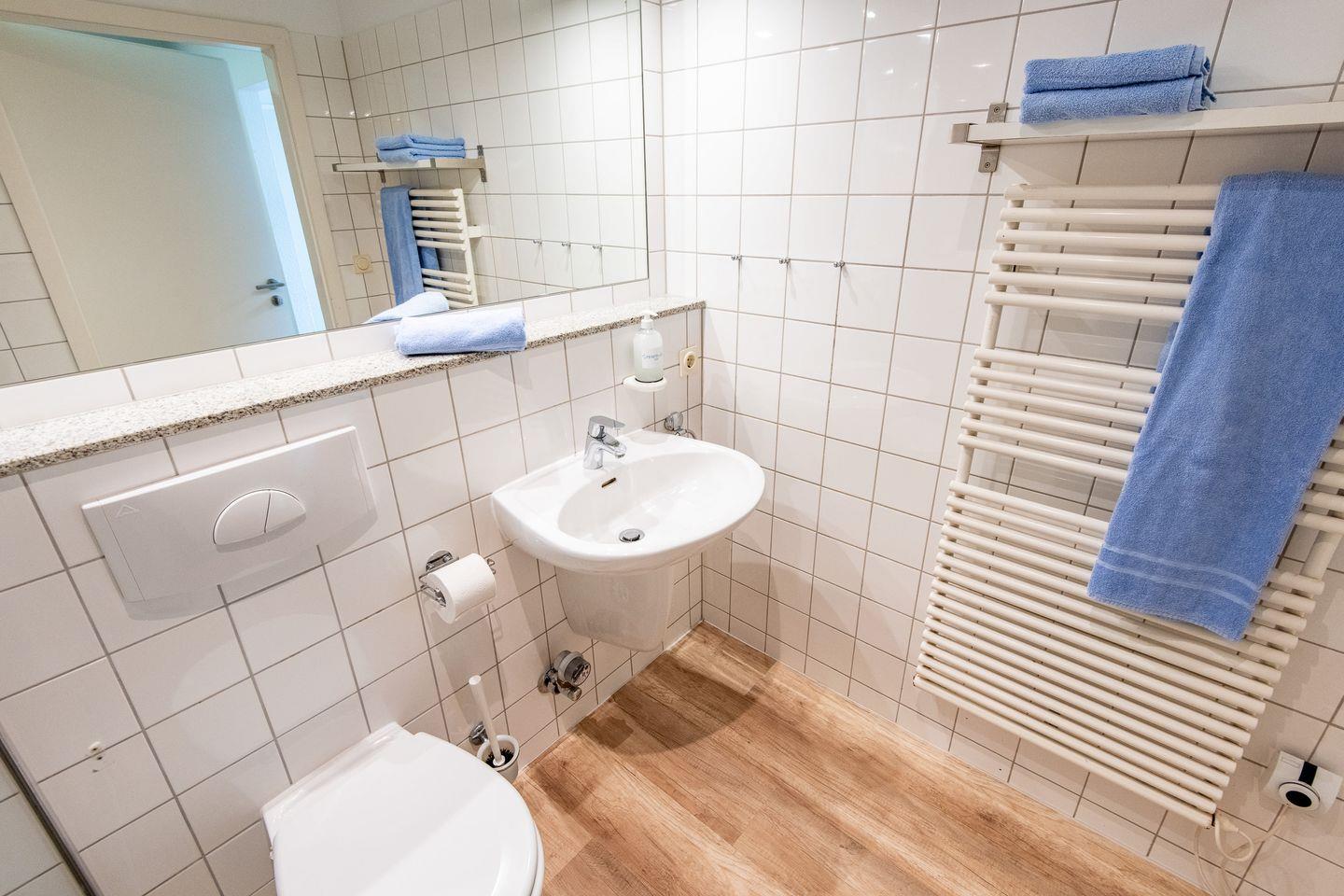 Das Badezimmer ist mit einer bodengleichen Dusche, einem Waschbecken, einem WC mit Haltegriffen und einer Handtuchheizung ausgestattet.