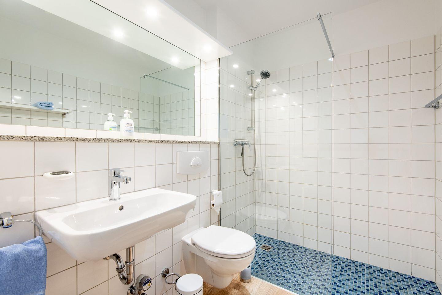 Vom Eingangsbereich aus erreichen Sie das Badezimmer. Dieses ist mit einer bodengleichen Dusche, WC, Waschbecken und einer Handtuchheizung ausgestattet.