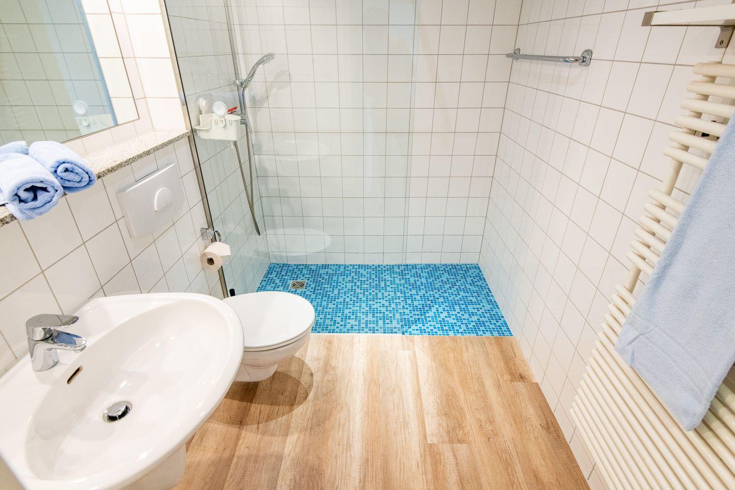Vom Eingangsbereich aus erreichen Sie das Badezimmer. Dieses ist mit einer bodengleichen Dusche, WC, Waschbecken und einer Handtuchheizung ausgestattet.