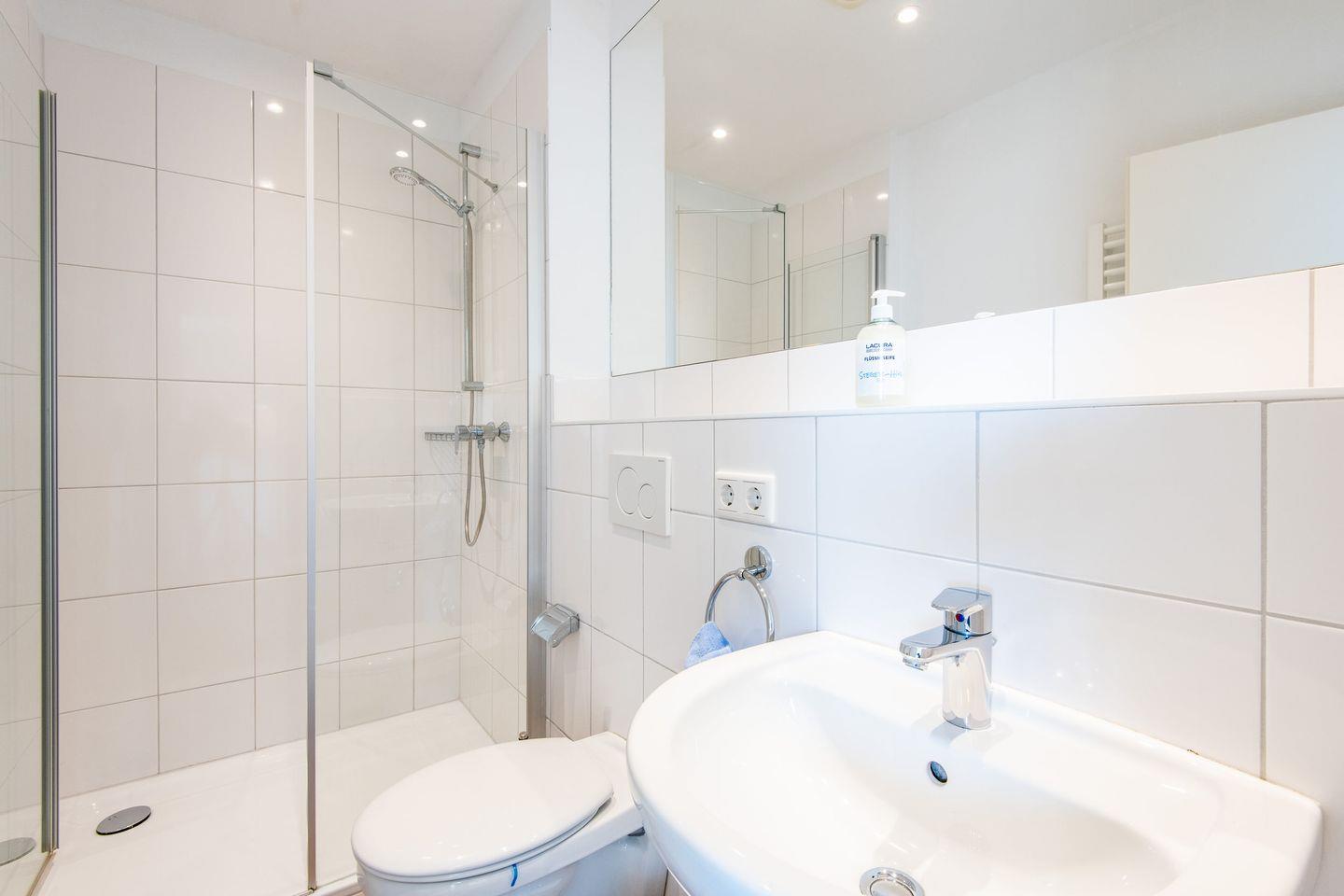 Die Wohnung verfügt über ein Badezimmer, welches mit einer bodengleichen Dusche, einem WC, einem Waschbecken und einer Handtuchheizung ausgestattet ist.