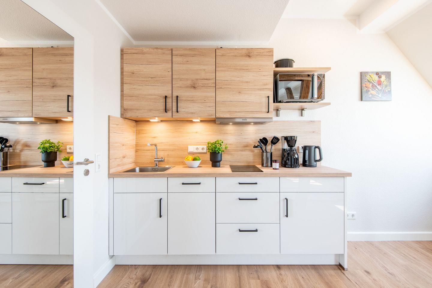 Die Küchenzeile ist mit einem 2er Ceranfeld, Kühlschrank, Geschirrspülmaschine, Kaffeemaschine, Toaster, Wasserkocher und Mikrowelle ausgestattet.