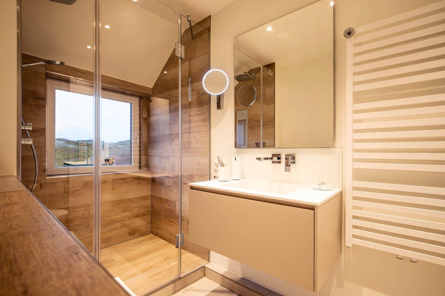 Das Hauptschlafzimmer befindet sich auf der gleichen Ebene und ist mit einem komfortablen Boxspringbett in der Größe 1,80 x 2,00 Meter ausgestattet. Ein geräumiger Kleiderschrank bietet ausreichend Stauraum für Ihre Garderobe. Das helle Duschbad ist modern gestaltet und verfügt über eine Regendusche sowie eine Sunshower mit Infrarotfunktion, die ein wohltuendes Sauna-Feeling vermittelt.