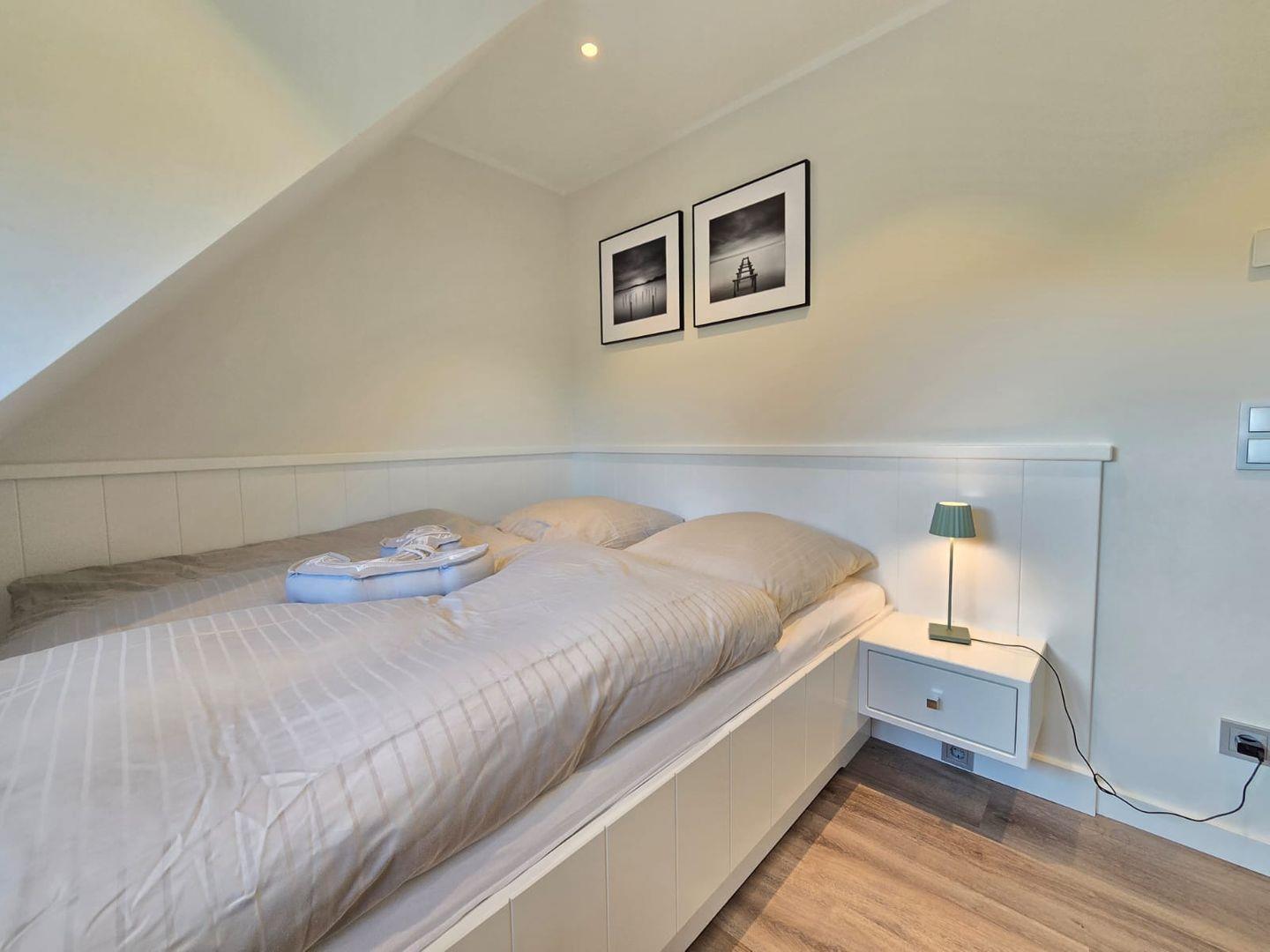 Im Dachgeschoss liegt ein weiterer Raum mit einem Doppelbett in der Größe 1,60 x 2,00 Meter, ebenfalls mit hochwertigen Federkernmatratzen ausgestattet, der zusätzlichen Schlafraum für Familien oder Paare bietet. Der geschmackvoll eingerichtete Bereich sorgt für Rückzugsmöglichkeiten und Ruhe nach einem erlebnisreichen Tag auf Sylt.