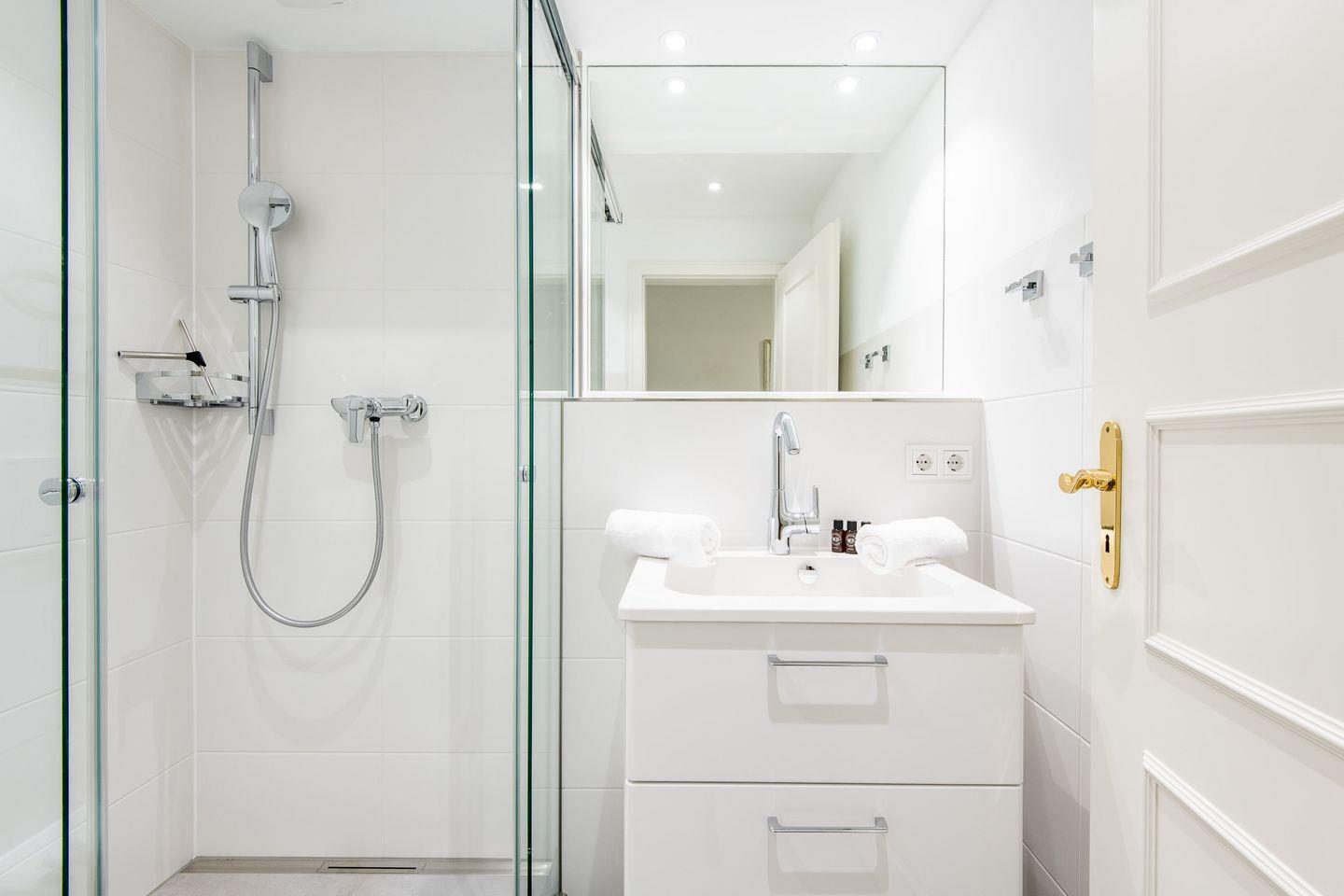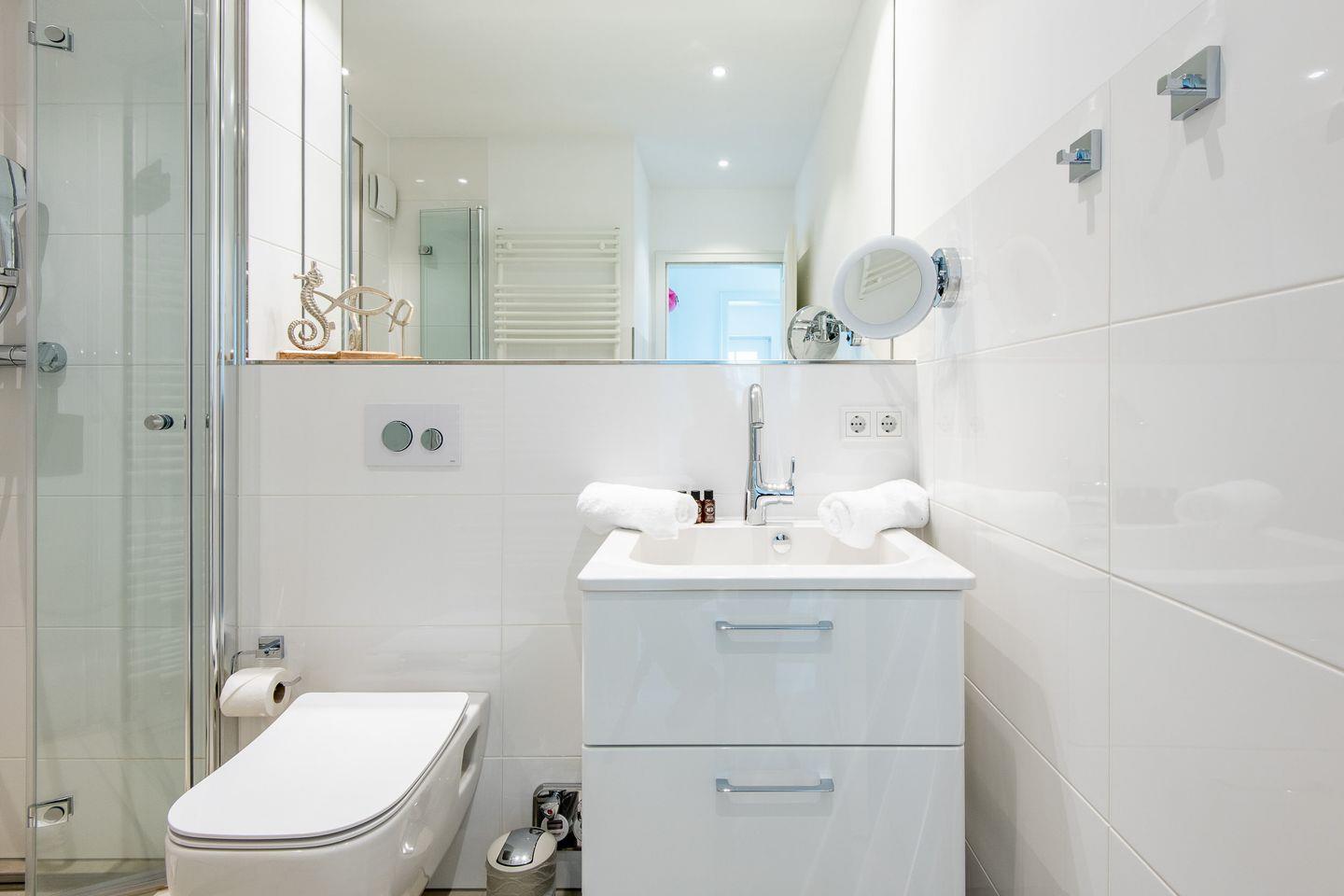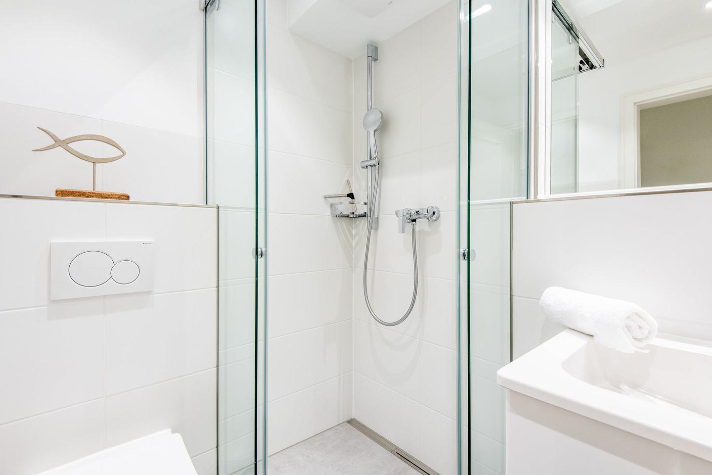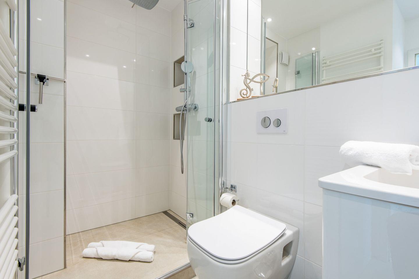 Die Wohnung bietet zwei stilvoll gestaltete Duschbäder, die sich ideal aufteilen lassen und für ein angenehmes Duscherlebnis sorgen. Das erste Badezimmer ist mit einer bodengleichen Dusche, WC und einem Haartrockner ausgestattet. Das zweite Badezimmer verfügt ebenfalls über eine bodengleiche Dusche und WC. Beide Bäder sind hell und funktional eingerichtet und bieten Ihnen eine komfortable Ausstattung für einen entspannten Aufenthalt.