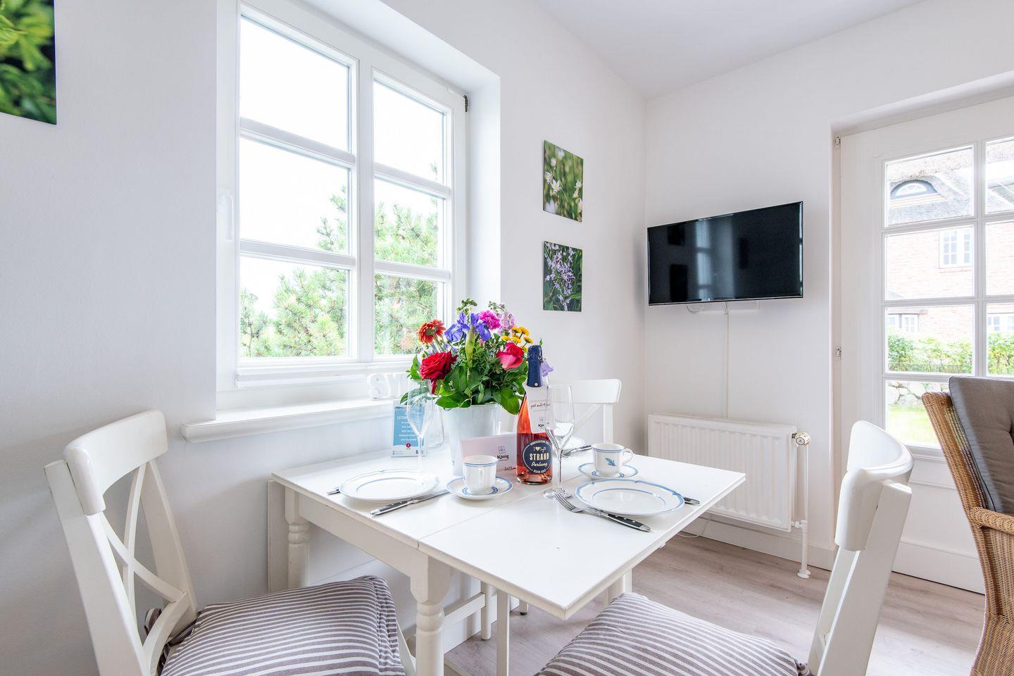 Das helle Wohnzimmer ist mit einer komfortablen Essecke ausgestattet und bietet direkten Zugang zur Sonnenterrasse. Hier können Sie die herrliche Nordseeluft genießen und im eigenen Garten entspannen.