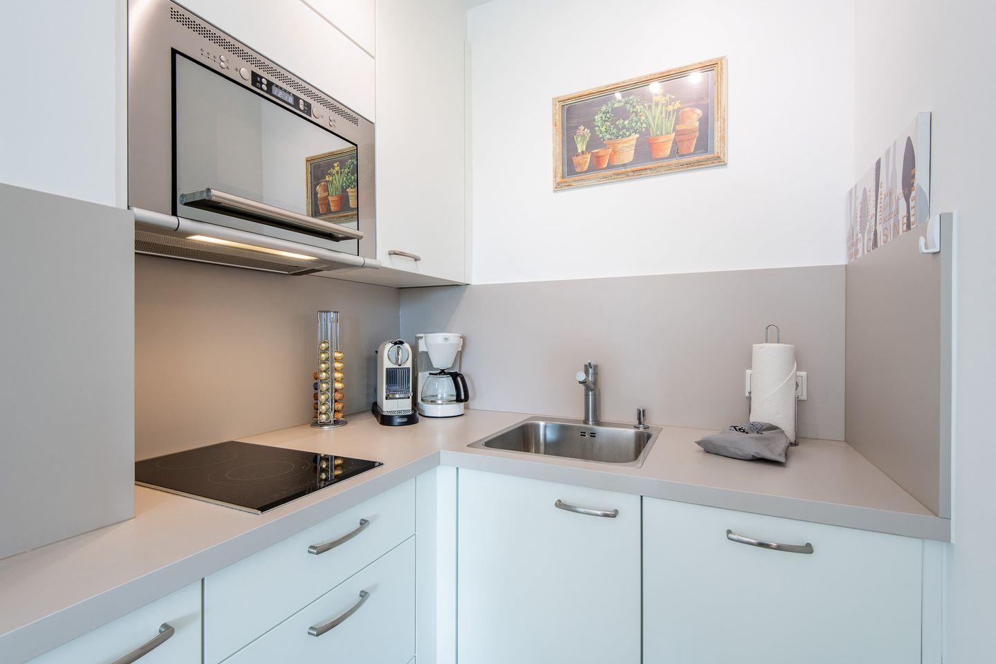 Die offene Küche ist voll ausgestattet und bietet alle Annehmlichkeiten für eine entspannte Selbstverpflegung. Hier können Sie Ihre Lieblingsmahlzeiten in angenehmer Atmosphäre zubereiten.