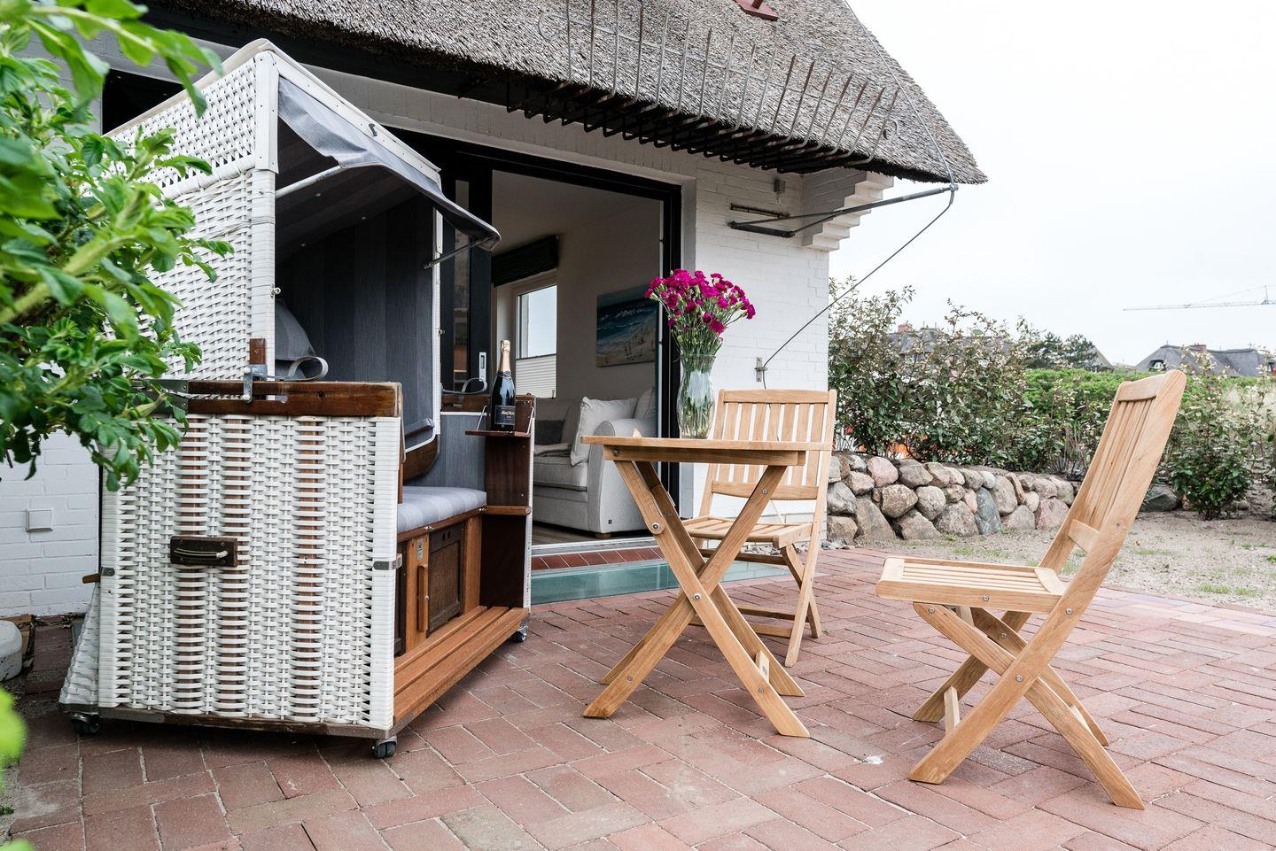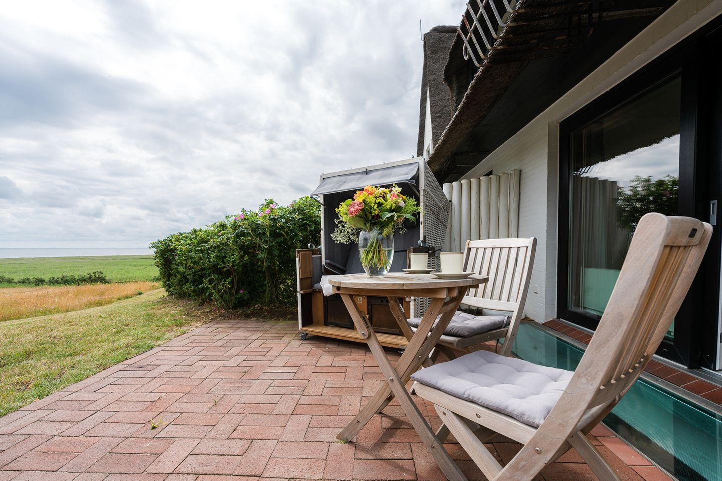 Dieses reetgedeckte Haus liegt am Ende einer Sackgasse direkt am Wattenmeer in Rantum auf Sylt. Die Wohnung erstreckt sich über 2 Etagen. Vom Wohnzimmer und der Terrasse aus schauen Sie direkt über ein weitgehend naturbelassenes Grundstück direkt auf das Meer. Das bunte Treiben vieler Wildvögel, so wie die wechselnden Gezeitenströme können Sie hier ganz in Ruhe beobachten. Die Wohnung Sehnsucht nach Meer hat vom Wohnraum und der großen Terrasse aus einen wunderschönen Blick auf das Wattenmeer. Trotzdem ist es auch zum Weststrand nur 5 min. zu Fuß. Sie können z. B. ganz idyllisch im komfortablen Strandkorb auf der Terrasse frühstücken und dabei den traumhaften Blick auf das Meer genießen. Frühaufsteher kommen oft in den Genuss eines Sonnenaufgangs über dem Wattenmeer. Somit kann Ihr Urlaubstag ganz entspannt beginnen. Die legendären Restaurants Sansibar, Samoa Seepferdchen und einige andere erreichen Sie über einen Spazierweg am Watt oder einer kurzen Strandwanderung. Die Bushaltestelle befindet sich in unmittelbarer Nähe (ca. 20 m Haltestelle Rantum Süd). Neben dem Busstopp beginnt auch ein wunderschöner Wander- & Radweg der durch die Sylter Dünenlandschaft bis nach Hörnum führt. Dieser wird allmorgendlich auch gern als Jogging Pfad genutzt.