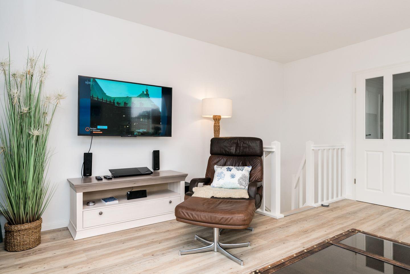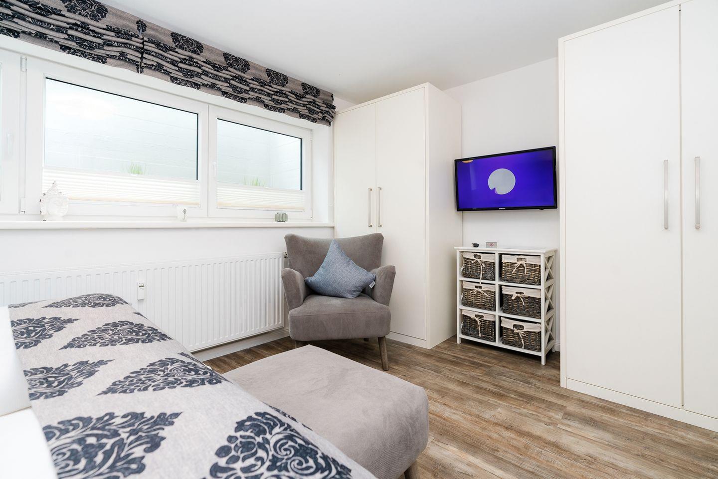 Im Erdgeschoss befindet sich der großzügige Wohn-/ Essbereich, ausgestattet mit einer komfortablen Doppelschlafcouch, einem Ledersessel, Smart-TV und einem Esstisch für 4 Personen. Die separate Küche ist ausgestattet mit einem Backofen mit Mikrowellenfunktion, Ceran-Kochfeld, einer Kaffeemaschine sowie eine Nespresso Kapselmaschine. Das Schlafzimmer verfügt über ein sehr bequemes Boxspringbett (180 cm breit) und eine große Fensterfront und befindet sich im Untergeschoss der Wohnung. Das Schlafzimmer ist noch mit einem zusätzlichen Smart-TV ausgestattet. Das Bad, ebenfalls im UG des Hauses, verfügt ebenfalls über ein Fenster und ist mit einer ebenerdigen Regendusche, sowie einem Kosmetikspiegel, einem fest intregiertem Radio und Fußbodenheizung, ausgestattet. Fahrradständer und ein reservierter Parkplatz befinden sich direkt vor und neben dem Haus. Eine geräumige Urlaubsoase par excellence. WLAN vorhanden (ohne Gewähr)