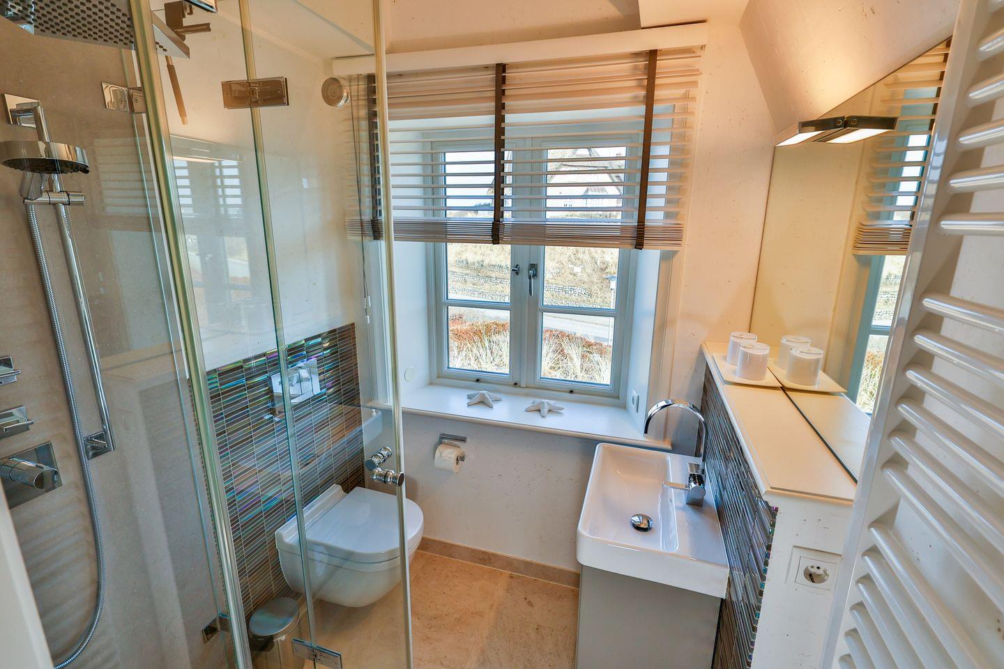 Im Erdgeschoss erwartet Sie ein einladender Wohnbereich, der durch die offene und freundliche Gestaltung zum gemeinsamen verweilen einlädt. Das gemütliche Wohnzimmer mit Essbereich bildet das Herzstück des Ferienhauses. Eine komfortable Couch und ein Fernseher sorgen für entspannte Stunden nach einem erlebnisreichen Urlaubstag. Besonders in den kühlen Jahreszeiten schafft der Kamin eine warme, behagliche Atmosphäre und lädt zu gemütlichen Abenden ein. Vom Wohnbereich aus gelangen Sie direkt auf die Terrasse, die mit Gartenmöbeln und einem Strandkorb (saisonal) ausgestattet ist. Direkt angrenzend befindet sich der großzügige Essbereich mit einem großen Esstisch, an dem alle Gäste bequem Platz finden. Die offene Küche zum Wohnbereich schafft eine angenehme Verbindung von Kochen und Beisammensein. Zur Ausstattung gehören Cerankochfeld, Backofen, Kühlschrank, zusätzlicher Gefrierschrank, Spülmaschine, Kaffeemaschine, Wasserkocher, Toaster sowie Küchenutensilien, Geschirr und Besteck. Damit sind die Voraussetzungen sowohl für das schnelle Frühstück als auch für gemeinsame Mahlzeiten in größerer Runde gegeben. Ebenfalls auf dieser Ebene befindet sich ein Gäste WC, welches Sie vom großzügigen Flur und Eingangsbereich aus erreichen.