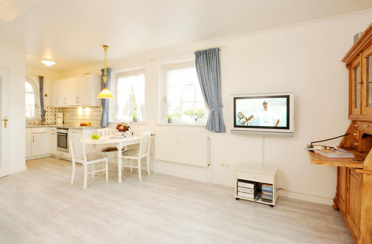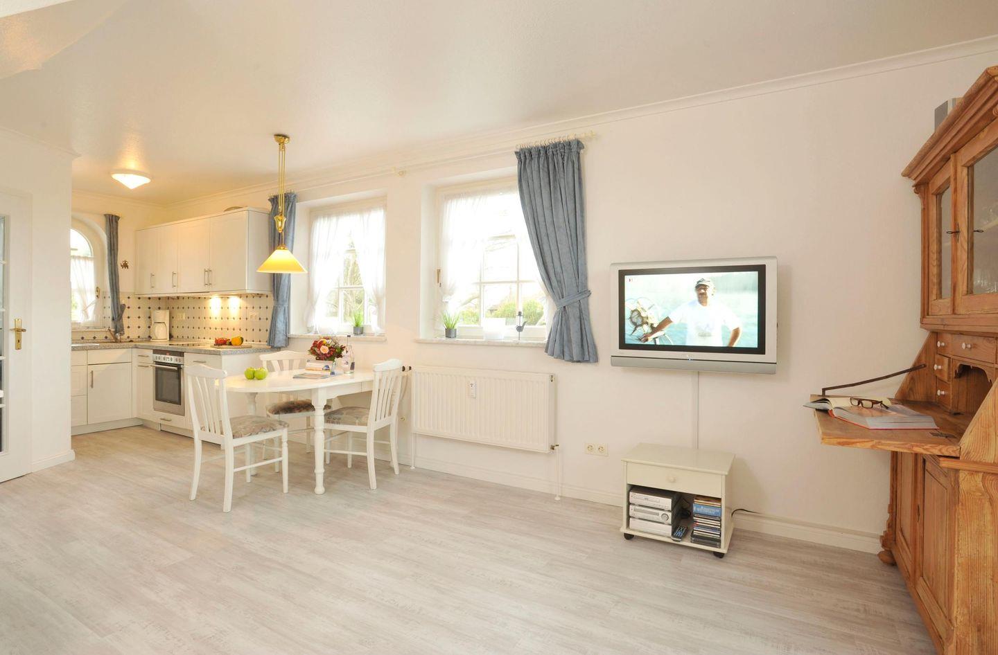 Das gemütliche Wohnzimmer ist mit einem Sofa für zwei Personen, zwei Sesseln, einem TV sowie einem Esstisch mit vier Stühlen ausgestattet. Von hier haben Sie direkten Zugang zur möblierten Gartenterrasse, die einen freien Blick auf das Wattenmeer bietet – perfekt, um die Natur und die frische Meeresluft zu genießen.