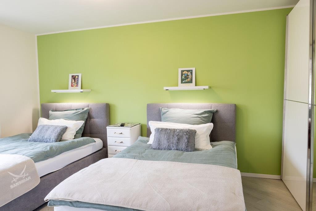 Die Ferienwohnung Casa Verde befindet sich sehr zentral zur Haupteinkaufsstraße in einer ruhigen Seitenstraße. 10 Gehminuten von der Ferienwohnung entfernt befindet sich der Schlosspark, der das ganze Jahr über unterschiedliche Attraktionen bietet. Die barrierefreie 90 qm- Ferienwohnung ist frisch (2023) saniert. Dabei wurde auf eine großzügige und offene Gestaltung geachtet, die auch zum Urlaub mit Rollstuhl einlädt. Im schön begrünten Hinterhof lädt eine zur Ferienwohnung gehörige, separate Terrasse zum Verweilen ein. Der Wohn- /Essbereich bietet eine vollausgestattete Küche mit Essecke, Wohnecke und Kaminofen. Das geräumige, moderne Bad ist barrierefrei mit Dusche ausgestattet. Handtücher sowie Bettwäsche werden gestellt. Das separate Schlafzimmer (16 qm) bietet neben einem TV zwei große separate Boxspring-Betten (1,20m x 2,00m). Diese können aber auch problemlos als Familienbett zusammengestellt werden.
