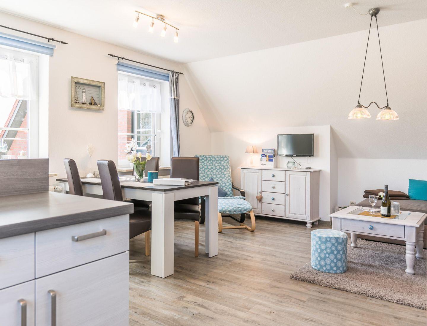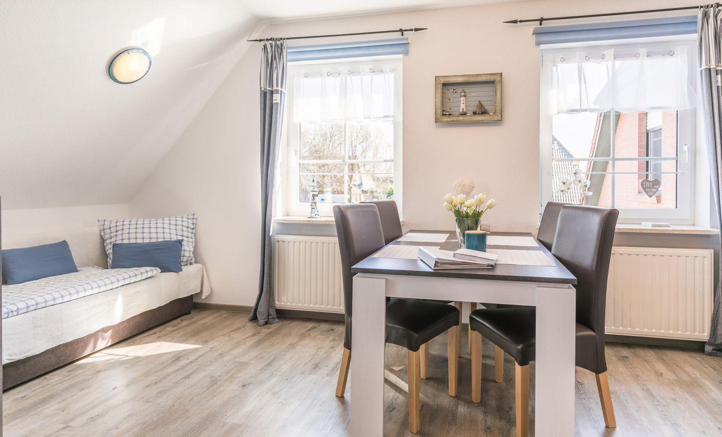 Die Wohnung liegt im 1. Obergeschoss, hat ein modernisiertes Schlafzimmer mit Doppelbett und zwei Schlafsofas im Wohnbereich. Eine maximale Belegung von 2 erwachsenen Personen und einem Kind ist daher möglich! Die Mitnahme eines weiteren Kindes auf Anfrage und gegen Aufpreis möglich.