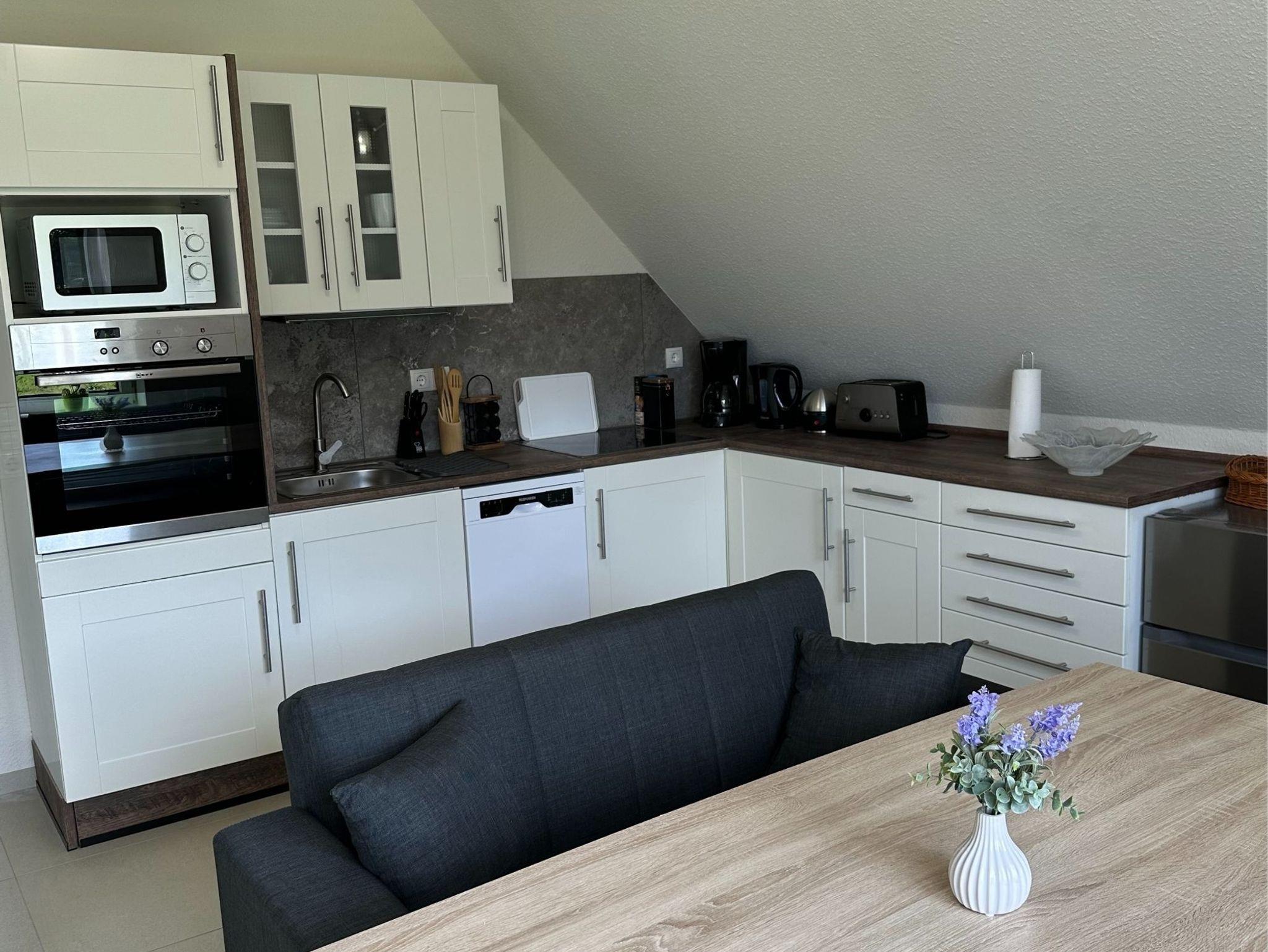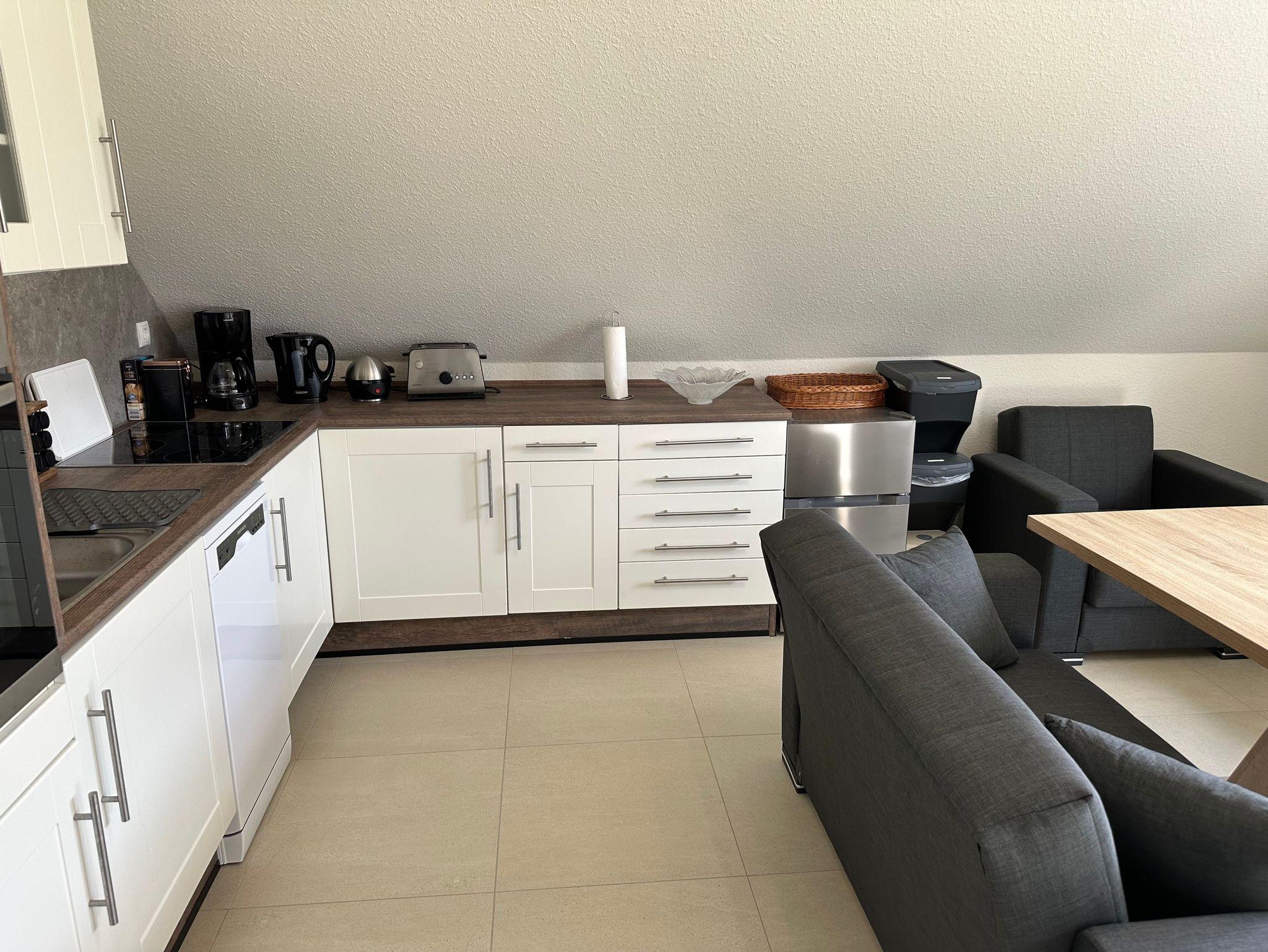Hinweis zur Erdgeschoßwohnung: Die Erdgeschoßwohnung ist ausgestattet mit einer großen Küche mit Sitzgelegenheiten bis zu 10 Personen. Einem Wohnschlafraum mit einer Schlafcouch (1,00m x 2,30m), ein Schlafzimmer (Doppelbett 1,80m x 2,00m/1 Matratze) und einem Bad mit einer Badewanne und einer ebenerdigen Dusche.