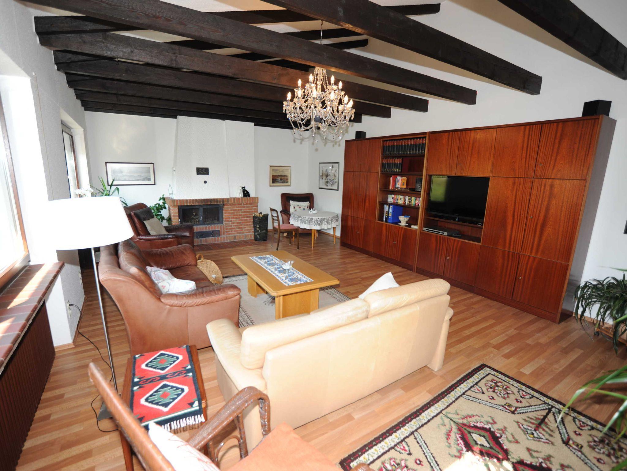 Das große lichtdurchflutete Wohnzimmer mit angrenzendem Balkon lädt zum Relaxen ein. Es beherbergt Sessel sowie 2 Sofas zum Musikhören von unserer Stereoanlage. Von Klassik bis Pop sind CD's in Vielfalt vorhanden. Auch befinden sich im Wohnzimmer ein großer TV und ein DVD Player. Vor dem Kamin lässt es sich gut schmökern. Etliche Bücher sind vorrätig. Auch eine Spielesammlung ist vorhanden.