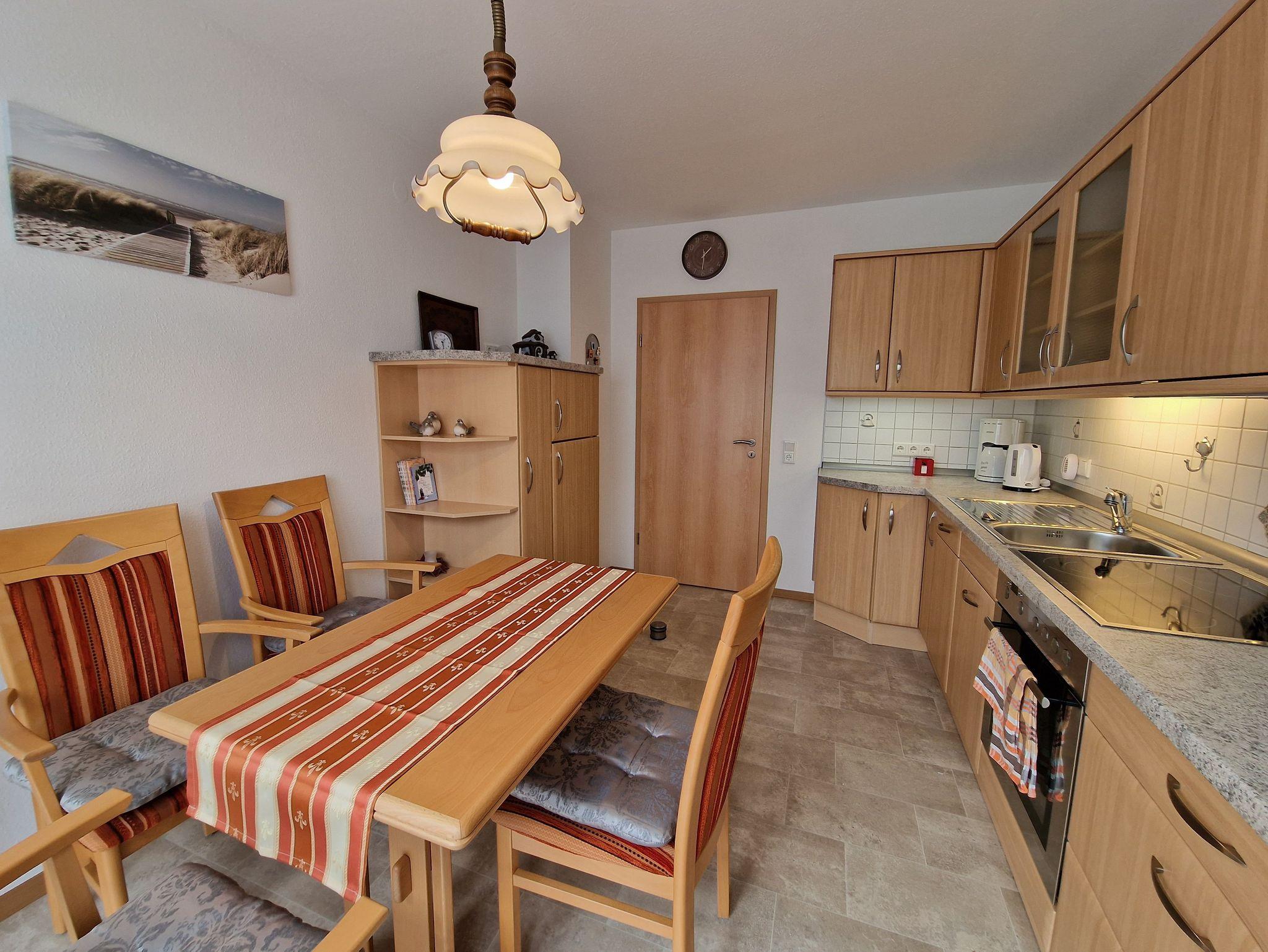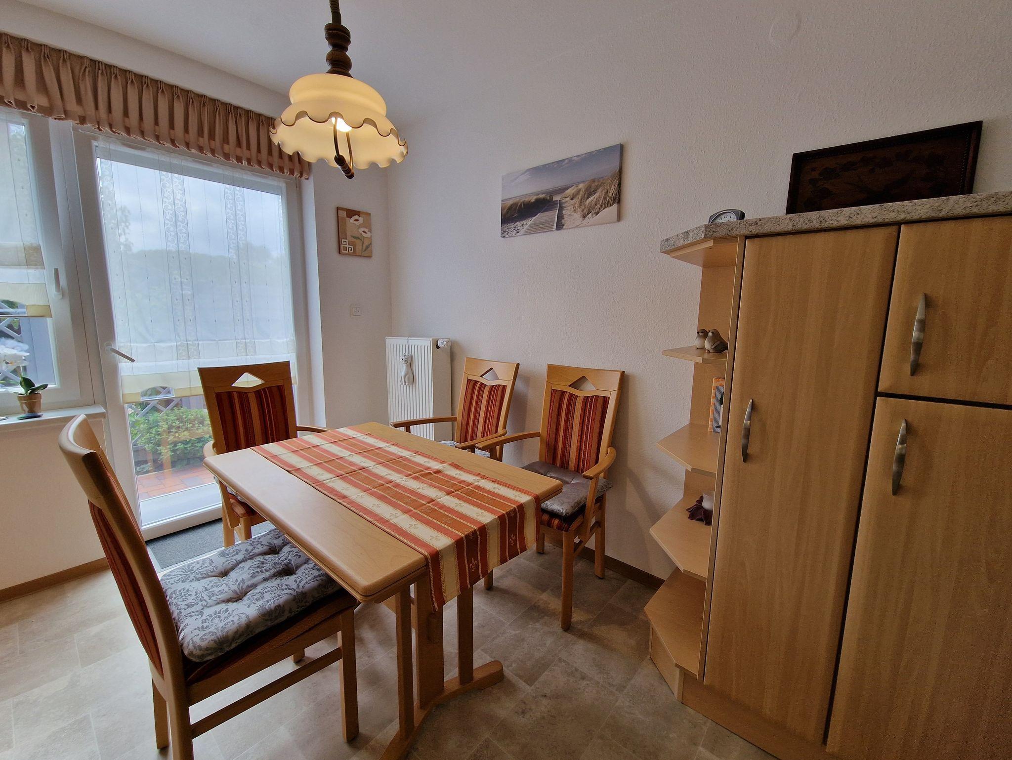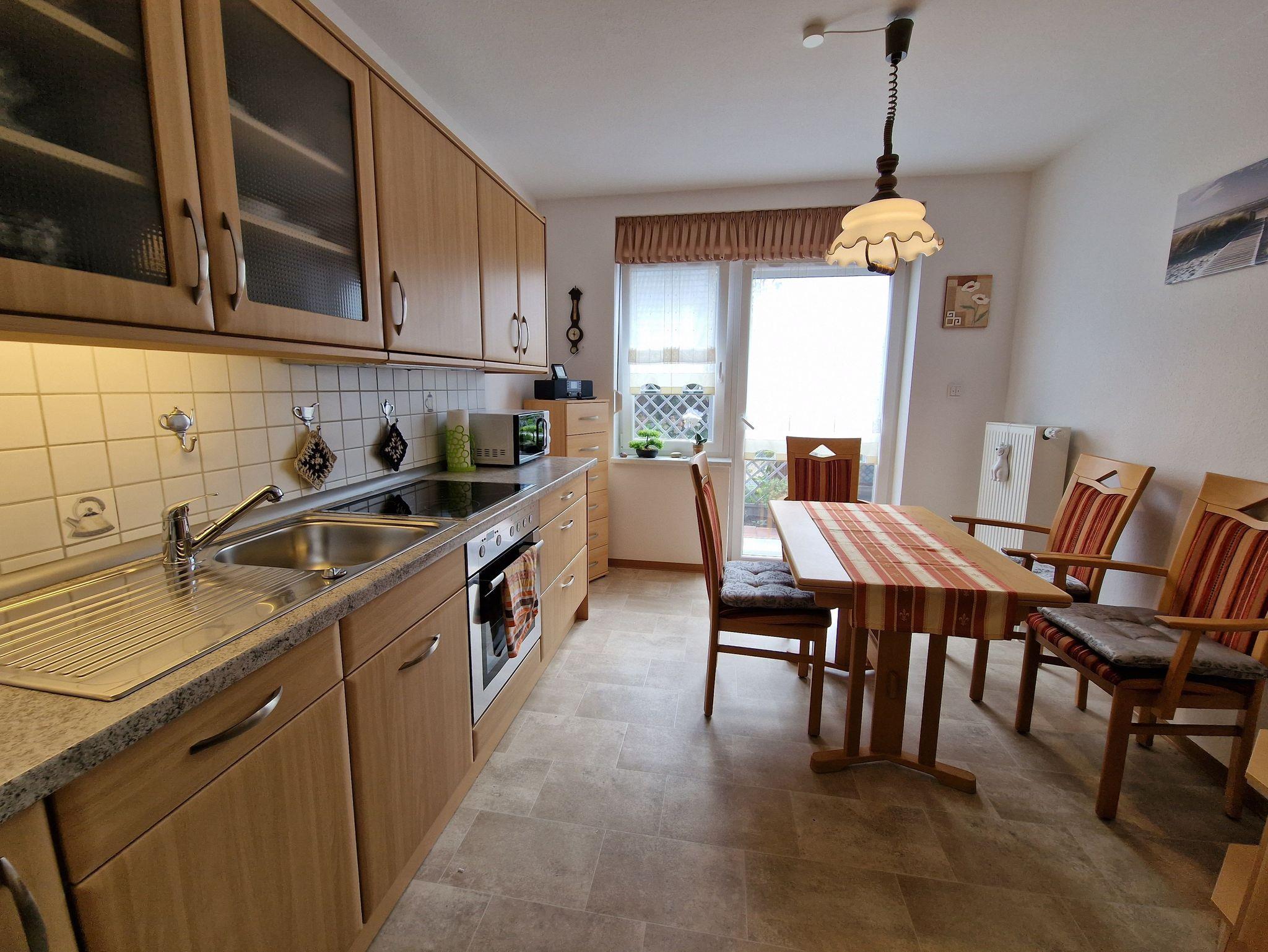 Unsere idyllisch gelegene Ferienwohnung für 2 Personen bietet Ruhe und Erholung. Separate Ferienwohnung, komplett eingerichtet, große Wohnküche mit Kühl- und Gefrierkombination, Spülmaschine, Mikrowelle, Eierkocher, Toaster, Mixer, Kaffeemaschine, Wasserkocher und Geschirr. TV, WLAN, Eingang Rollator geeignet, Bad mit barrierefreien Dusche, Terrasse mit Gartenmöbeln, Grill und elektrischer Markise. Fliegengitter an den Fenstern.