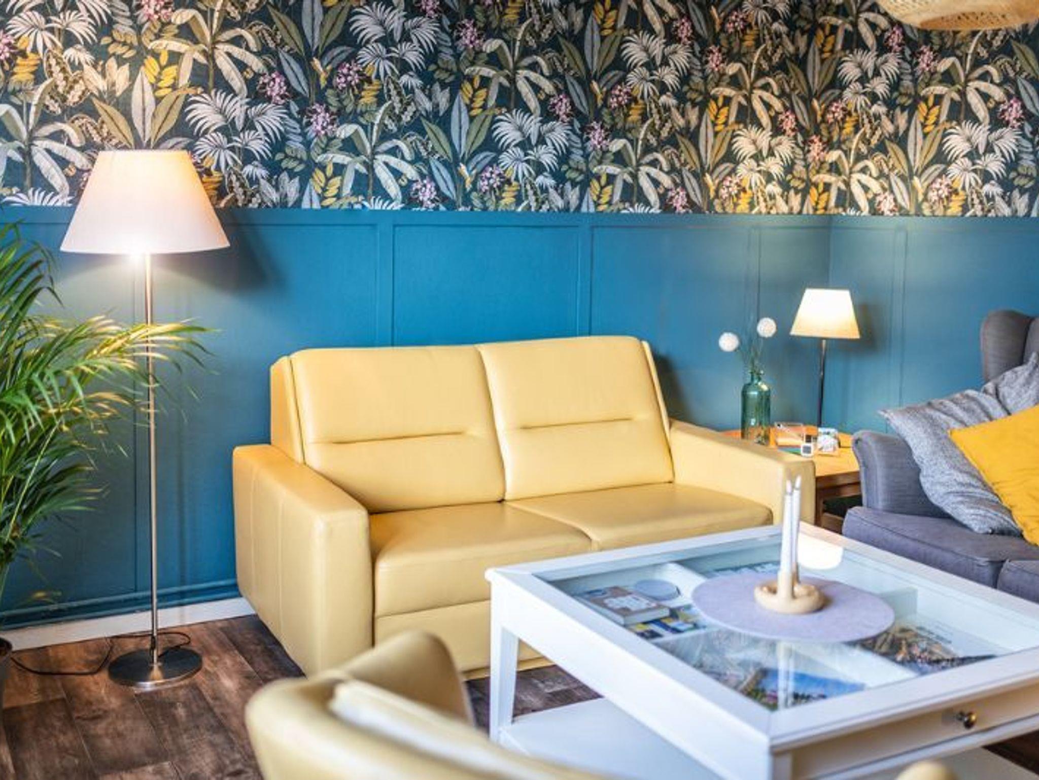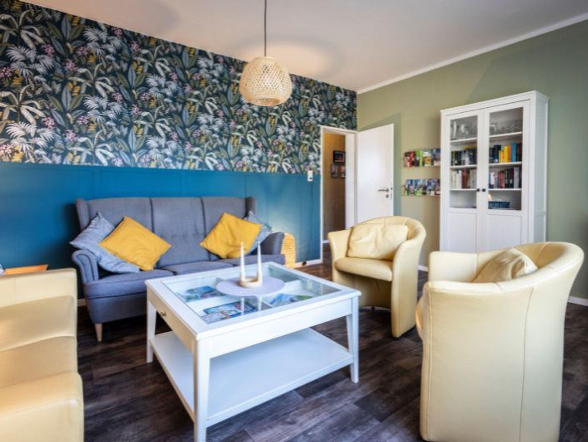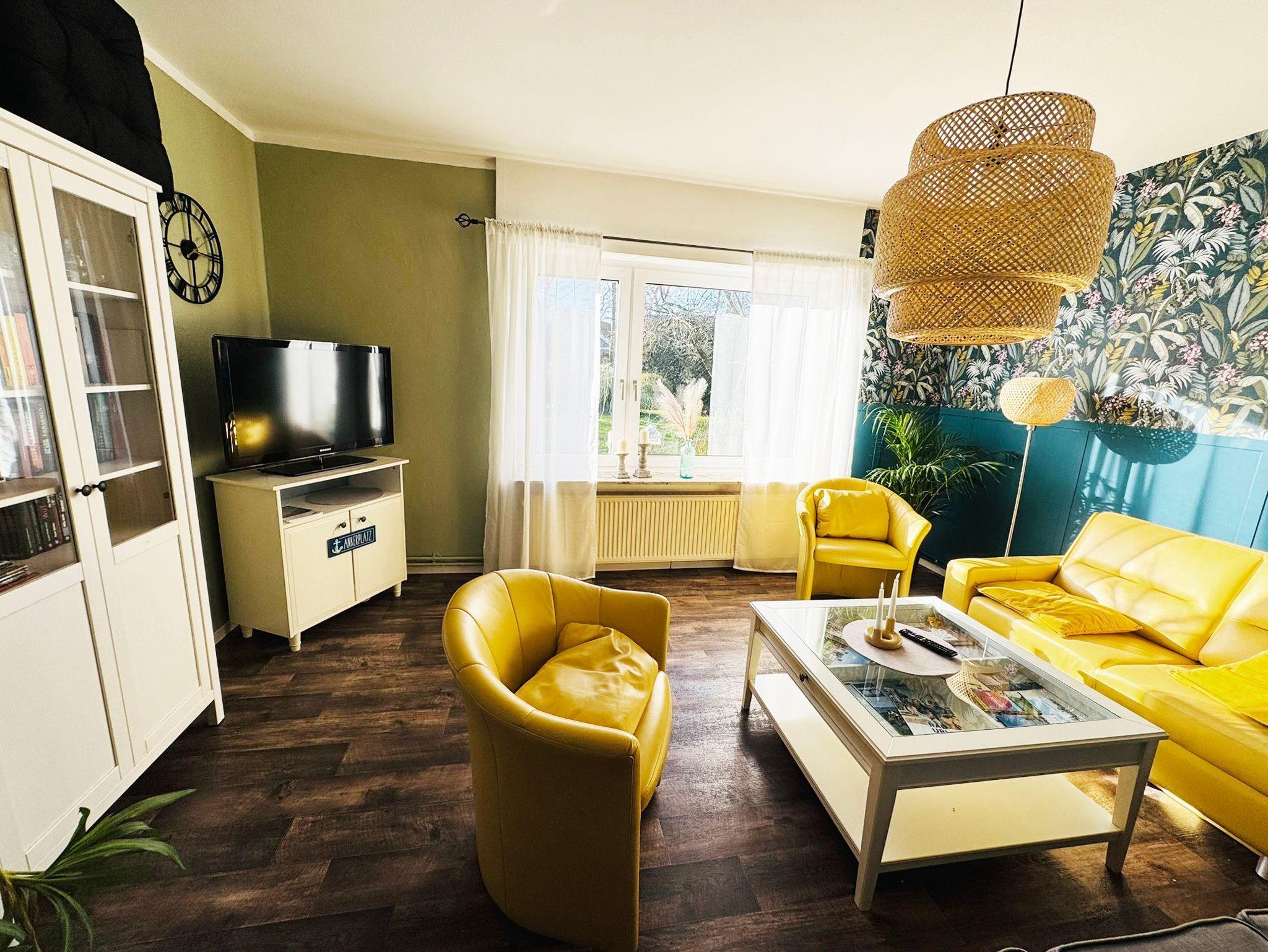 zur Verfügung. Das Wohnzimmer ist mit gemütlichen Möbeln und einem großen