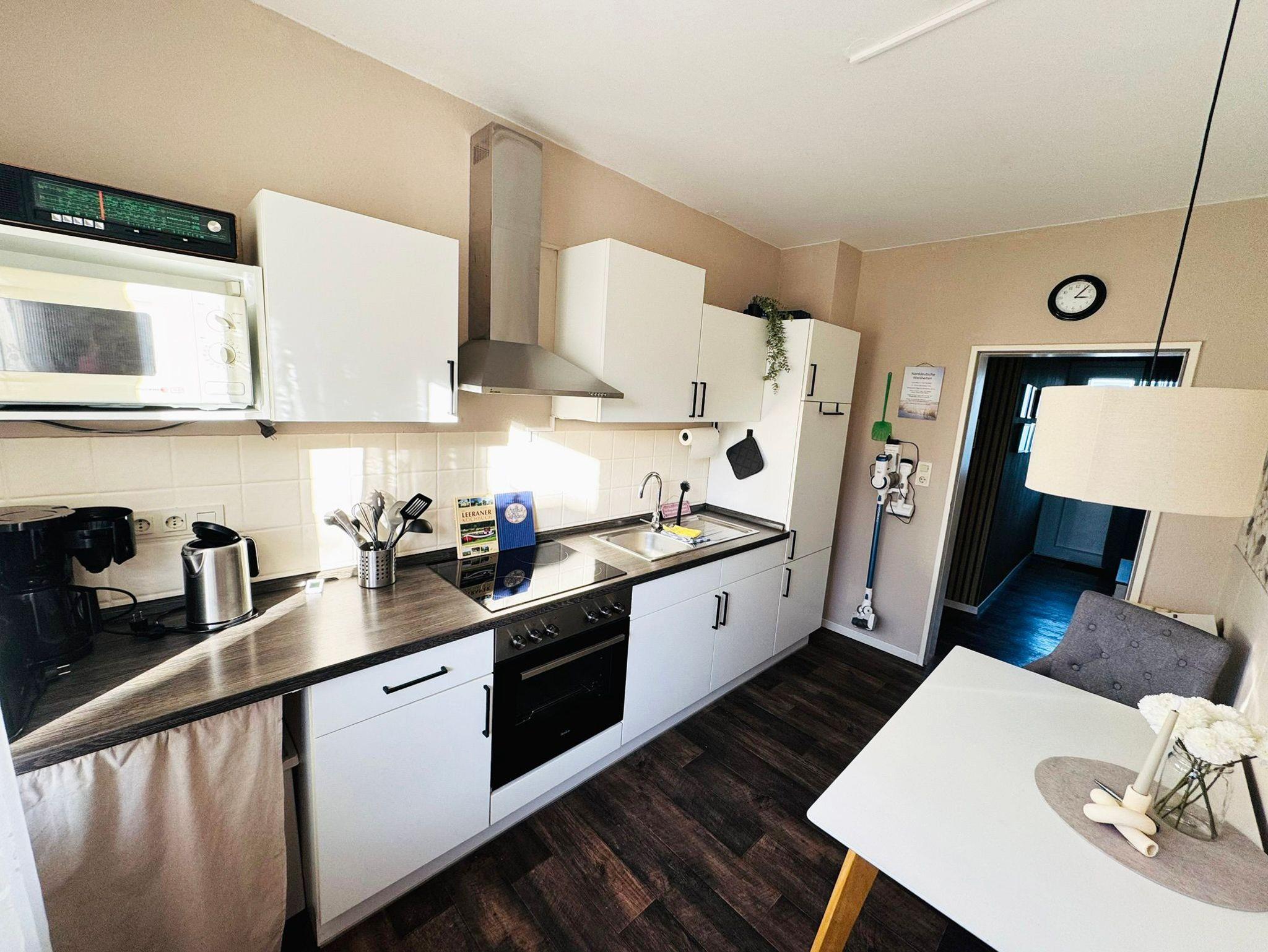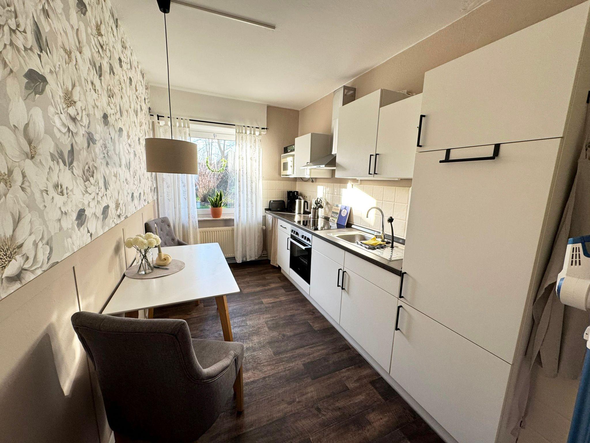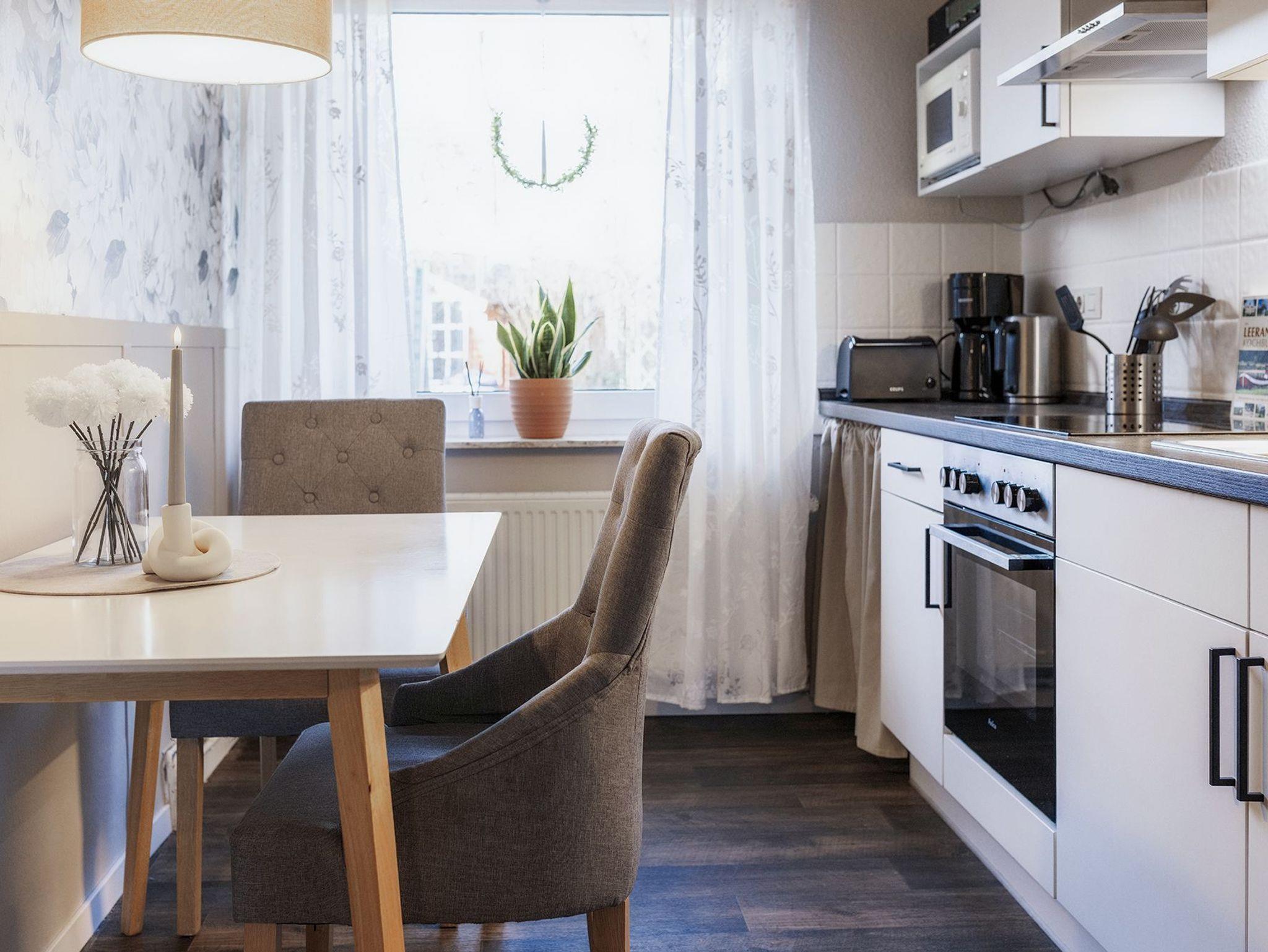mit Stühlen, Herd mit Backofen, Mikrowelle, Kaffeemaschine, Wasserkocher,