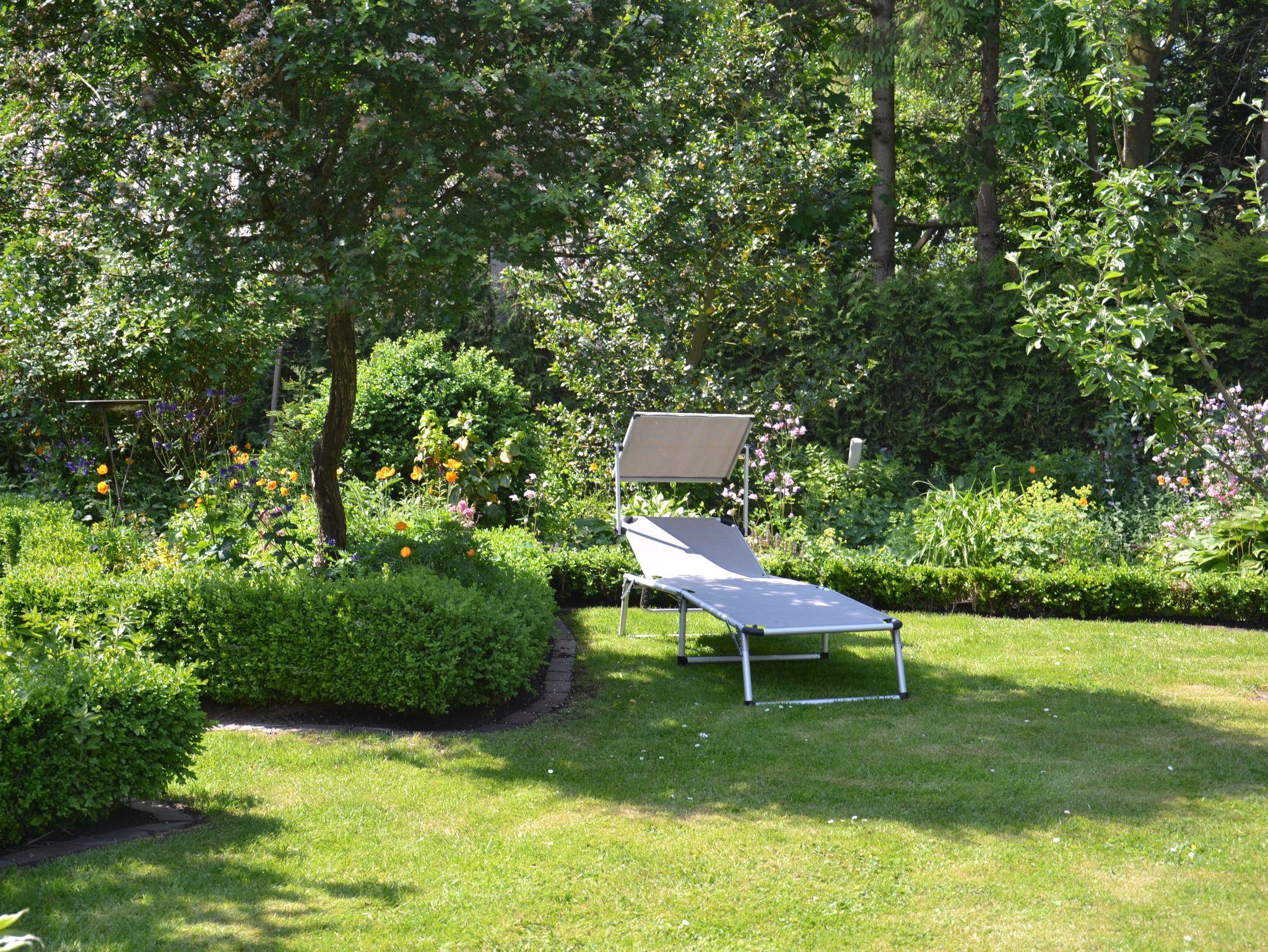Der Garten mit Liegewiese lädt zum Entspannen und Erholen ein. Stühle, Liegen,