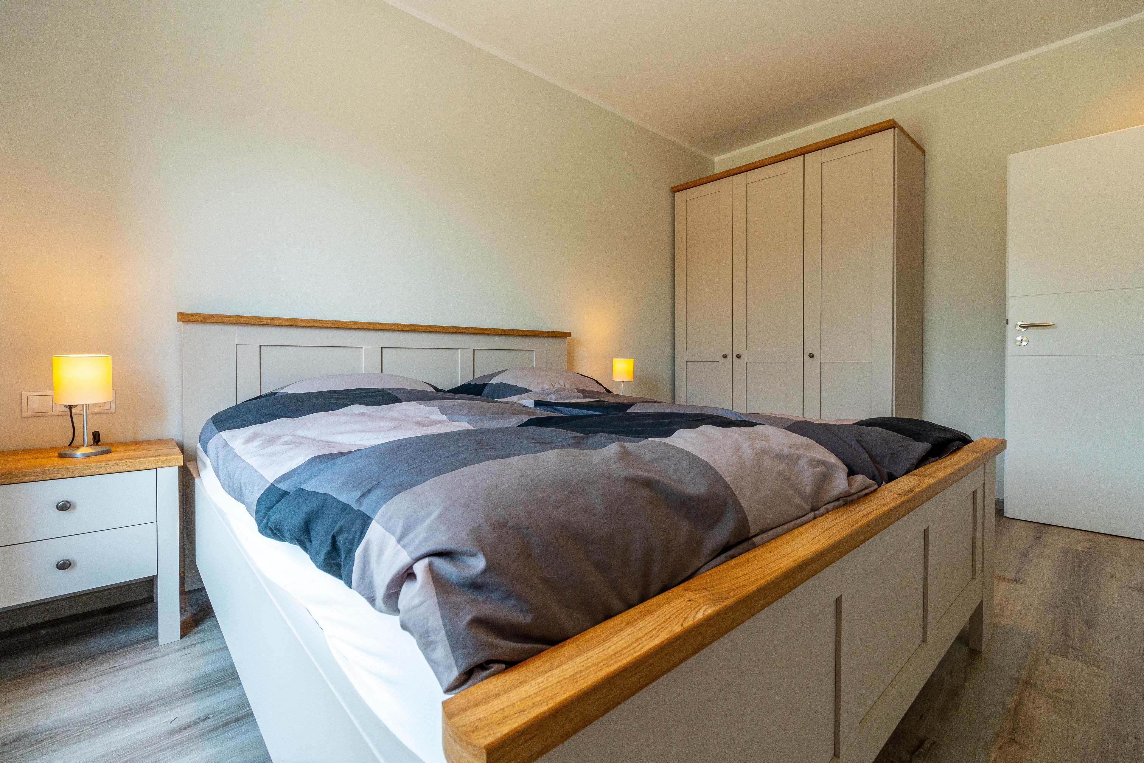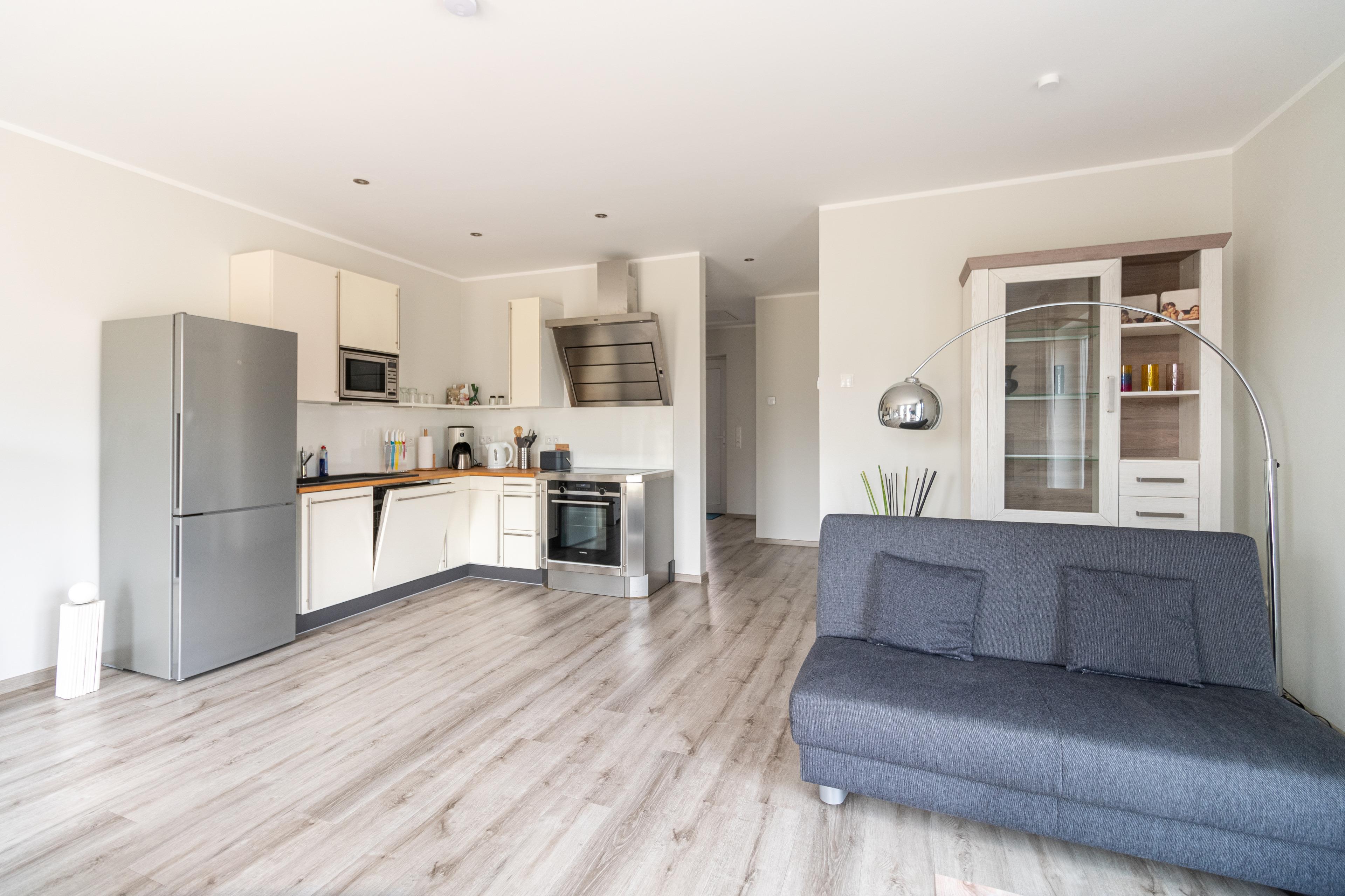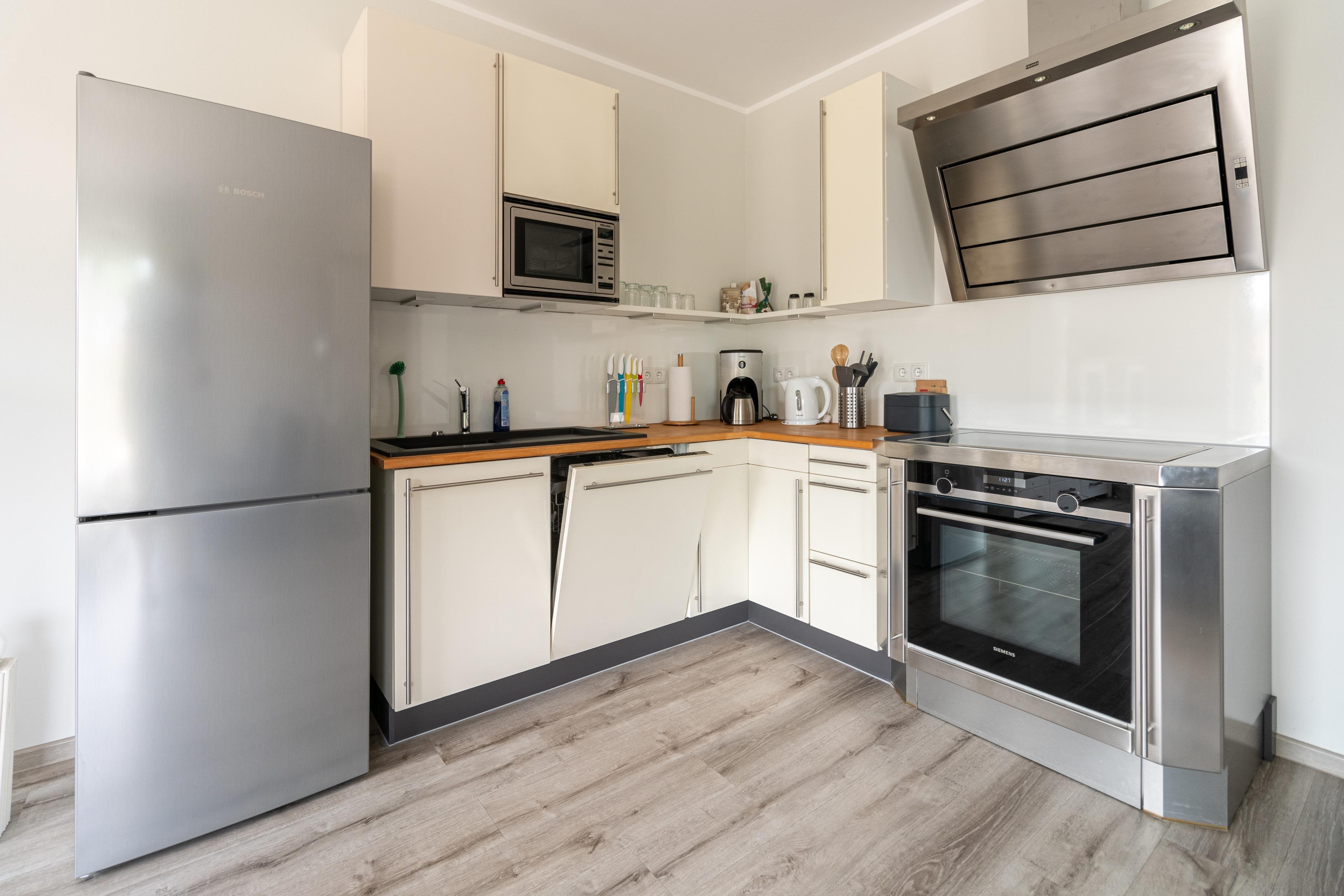 Komfortaustattung, Wohn-Essraum mit hochwertiger - komplett eingerichteter Einbauküche und Schlafsofa, Schlafraum mit Komfortbetten, Abstellraum in der Wohnung, Hauswirtschaftsraum, Strandsauna, Parkplatz am Haus.