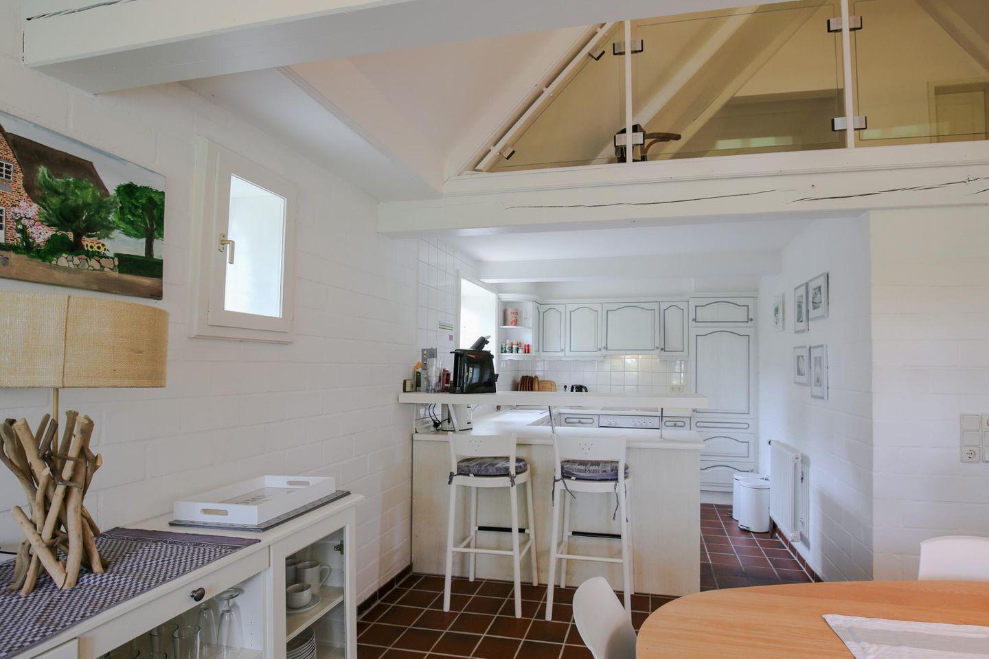 Das Ferienhaus ist im friesischen Stil eingerichtet und begeistert durch seinen großen, offenen Wohnraum mit Sofaecke vor dem Kaminofen, Flachbild-TV (Sat) und einen DVD/Blueray-Player, dem geselligen Essbereich und der offenen Küche mit Herd, Backofen, Kühlschrank, Geschirrspülmaschine, Kaffeemaschine (Filtergröße 4), Espressomaschine, Wasserkocher, Toaster, ausreichend Geschirr und Kochutensilien.