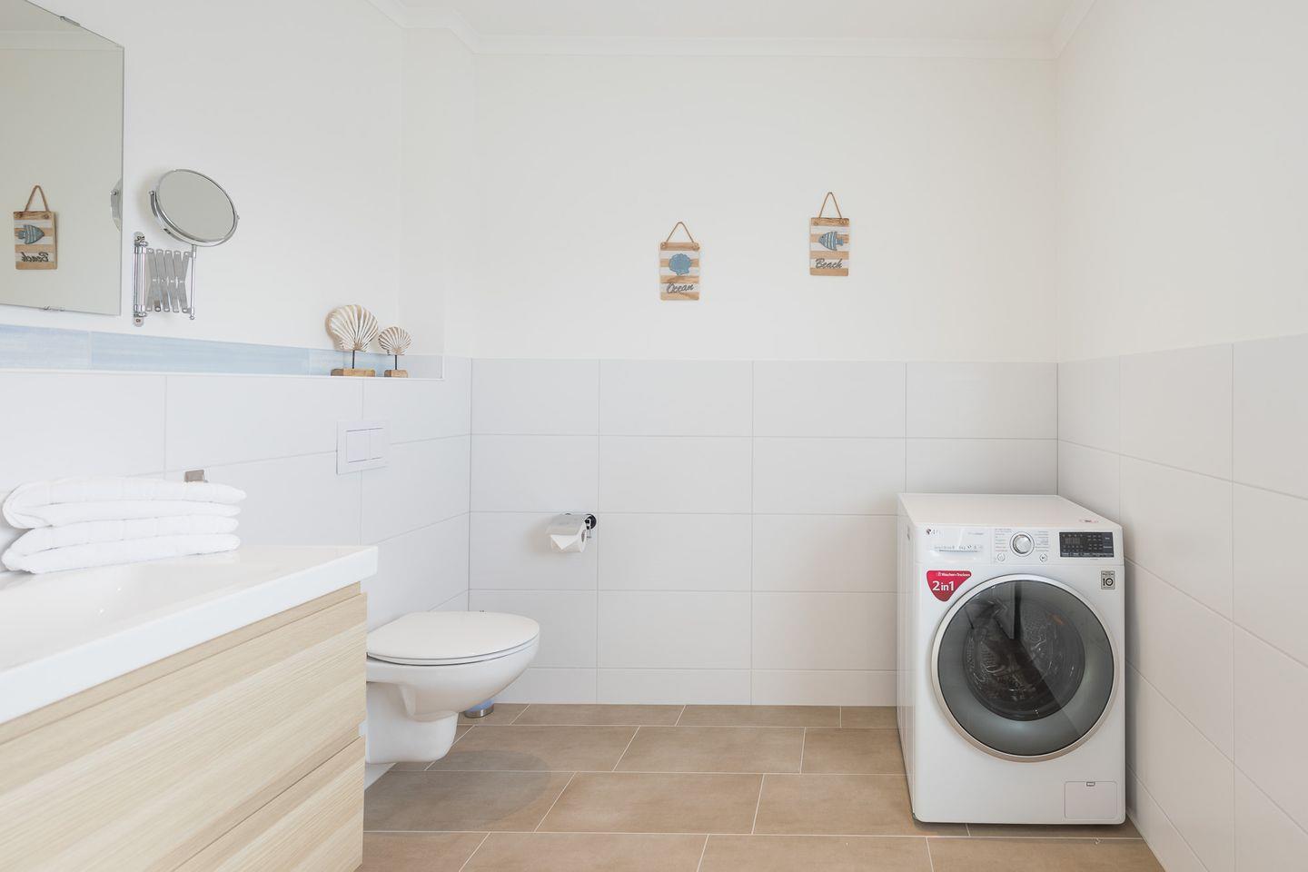 Die Bäder bieten Ihnen jeweils ein WC und eine Walk-in-Dusche. Die große Sauna und der Waschtrockner runden das Bild ab.