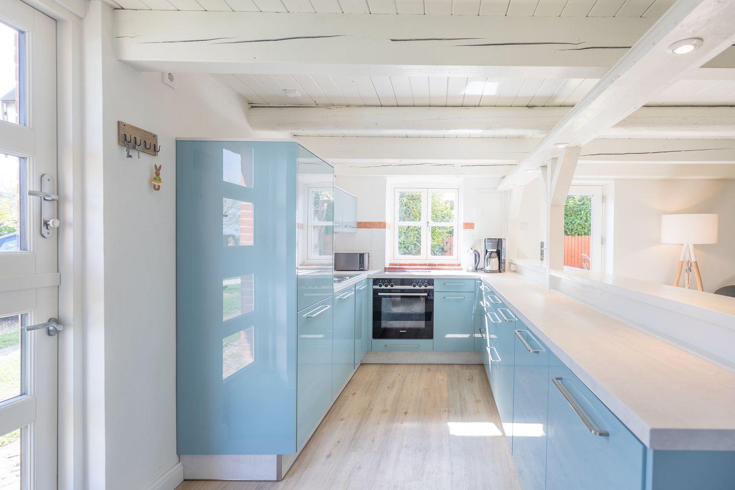 Das Ferienhaus ist im modernen friesischen Stil eingerichtet und begeistert durch seinen großen, offenen Wohnraum mit Sofaecke vor dem Kaminofen, Flachbild-TV (Sat), dem geselligen Essbereich und der offenen Küche mit Herd, Backofen, Kühlschrank, Geschirrspülmaschine, Kaffeemaschine (Filtergröße 4), Wasserkocher, Toaster, ausreichend Geschirr und Kochutensilien.