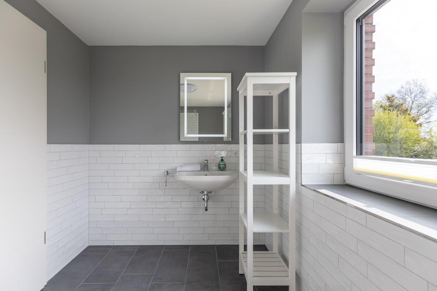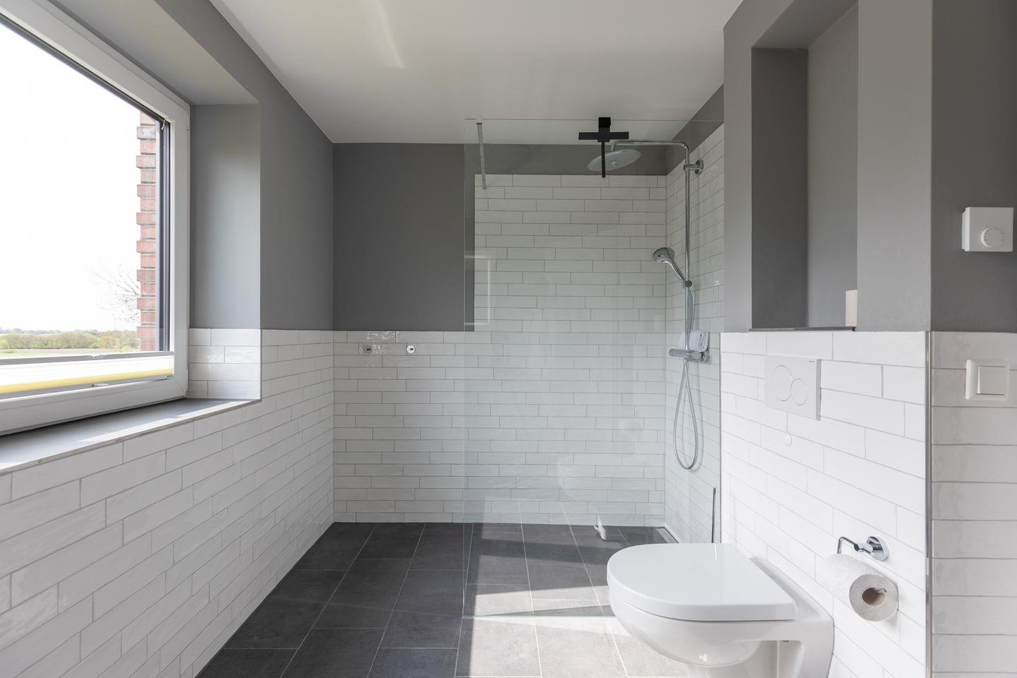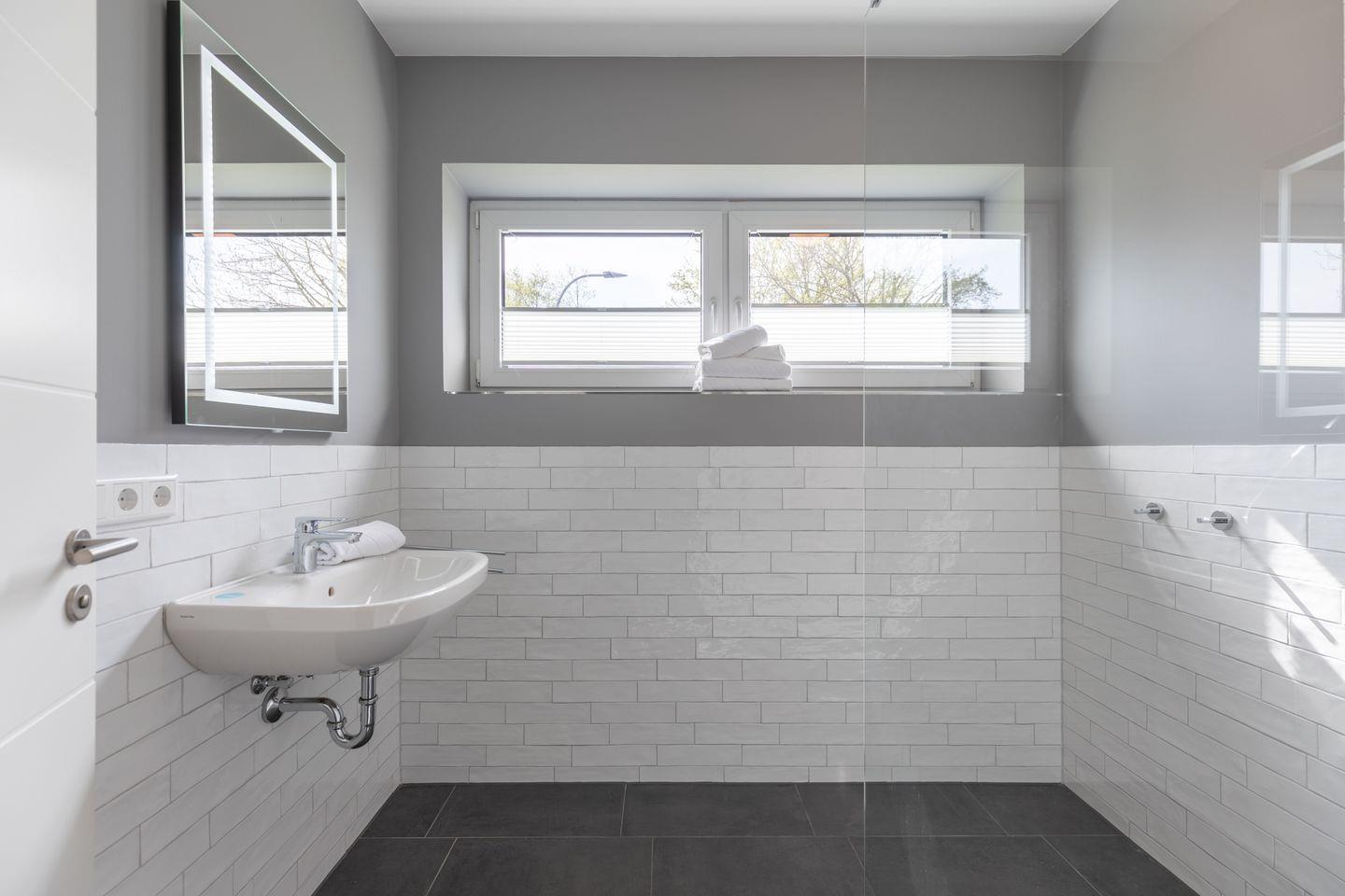 Das große, moderne Duschbad verfügt über eine bodengleiche Dusche.