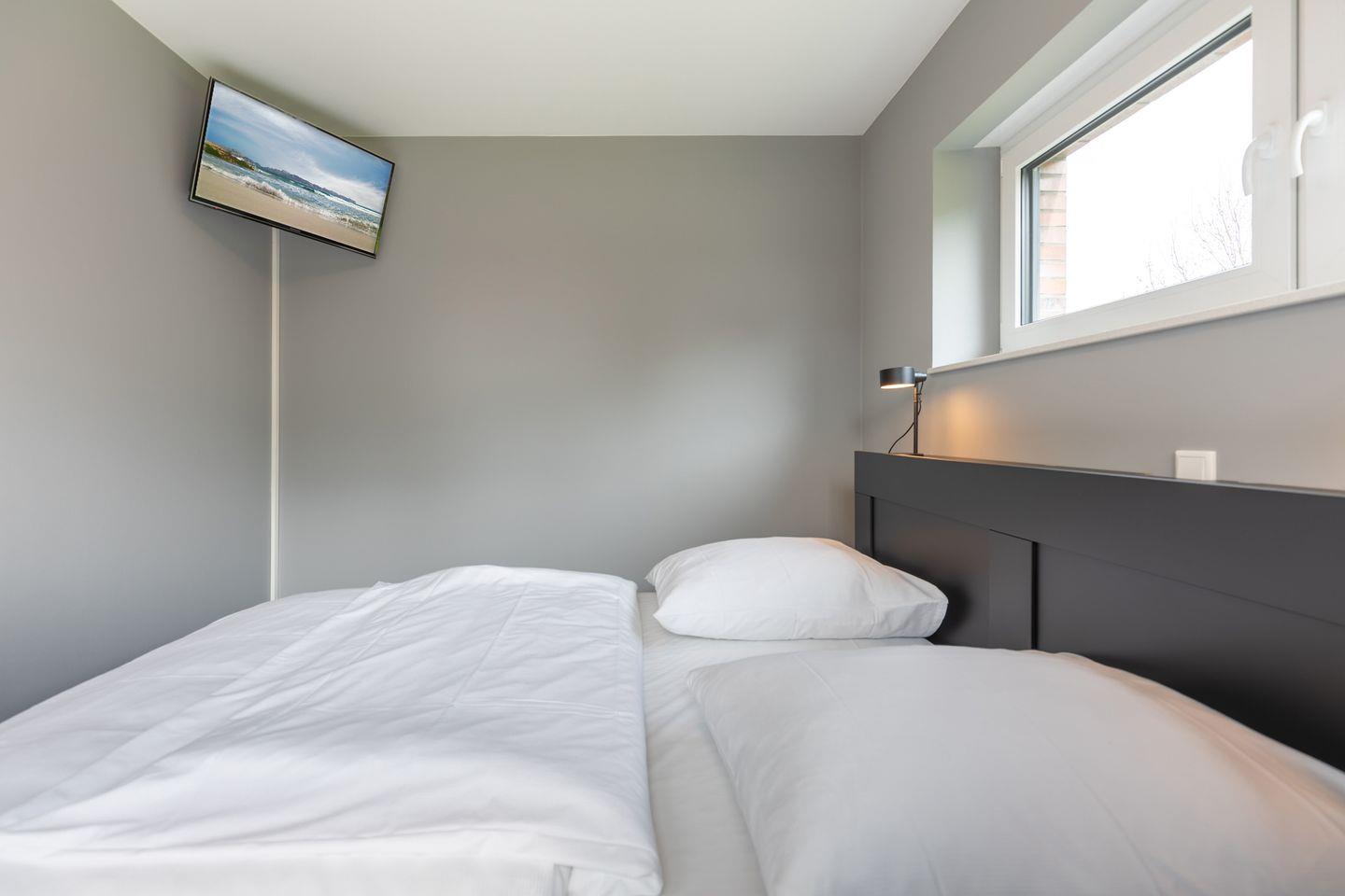 Auch im Erdgeschoss zu finden ist eines der insgesamt drei Schlafzimmer, ausgestattet mit einem Doppelbett (180x200), Kleiderschrank und TV.