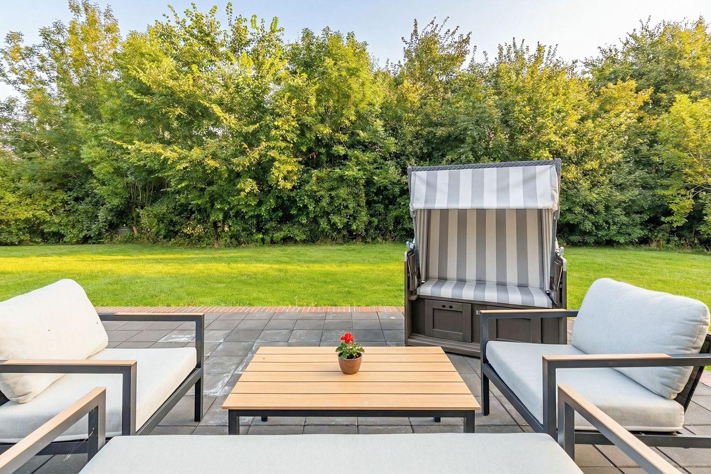 Auf der geschützten Terrasse stehen Ihnen Gartenmöbel und ein Gasgrill zur Verfügung.