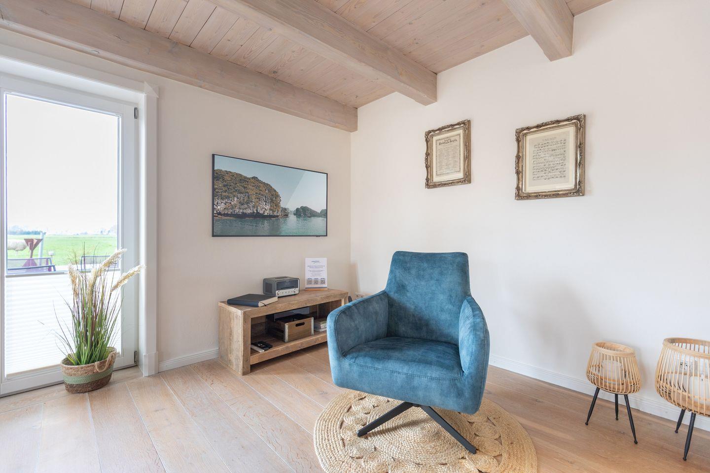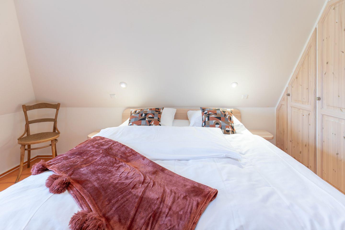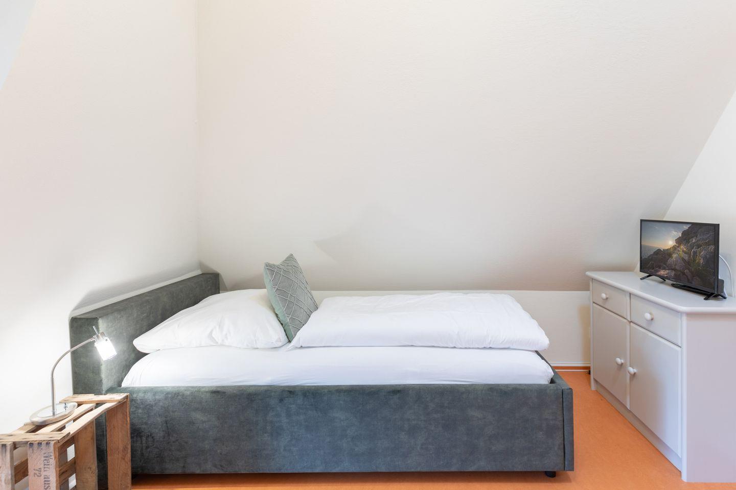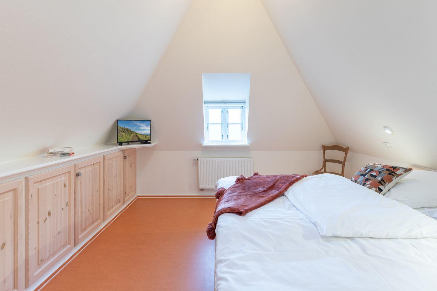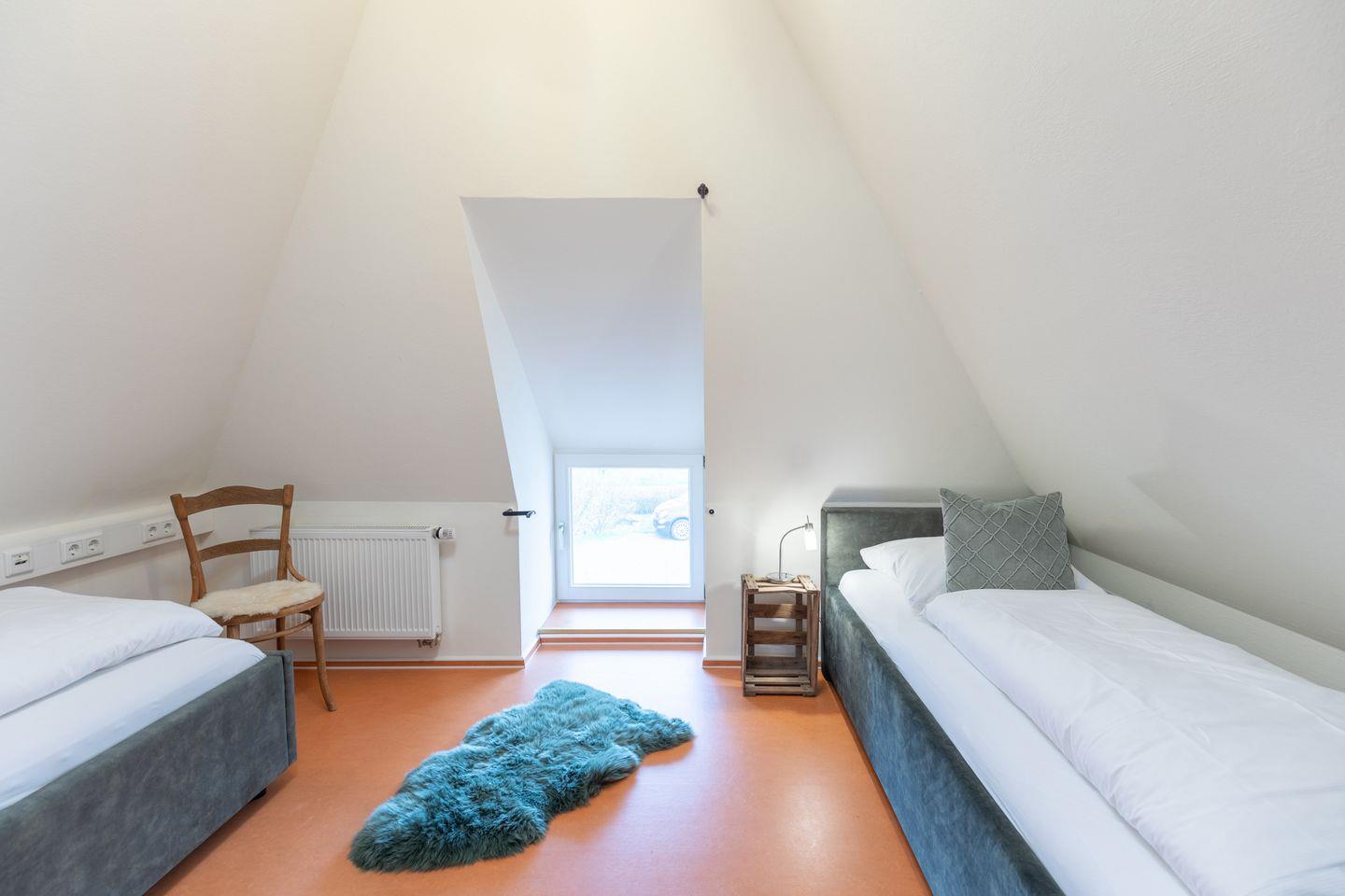 Vom Wohnbereich haben Sie einen herrlichen Blick auf die Landschaft und Felder sowie direkten Zugang zur Süd- & Westterrasse. Sie können mit bis zu 4 Personen in 2 Schlafzimmern übernachten. Beide Schlafzimmer erreichen Sie über die Treppe zum Obergeschoss. Das rechte Schlafzimmer verfügt über ein Doppelbett mit der Größe 1,80 x 2,00 m, einem Schrank und einem Flachbild-TV. Das andere Schlafzimmer verfügt über zwei Einzelbetten mit der Größe 90 x 200cm, auch dieses Zimmer ist mit einem Flachbild - TV ausgestattet.