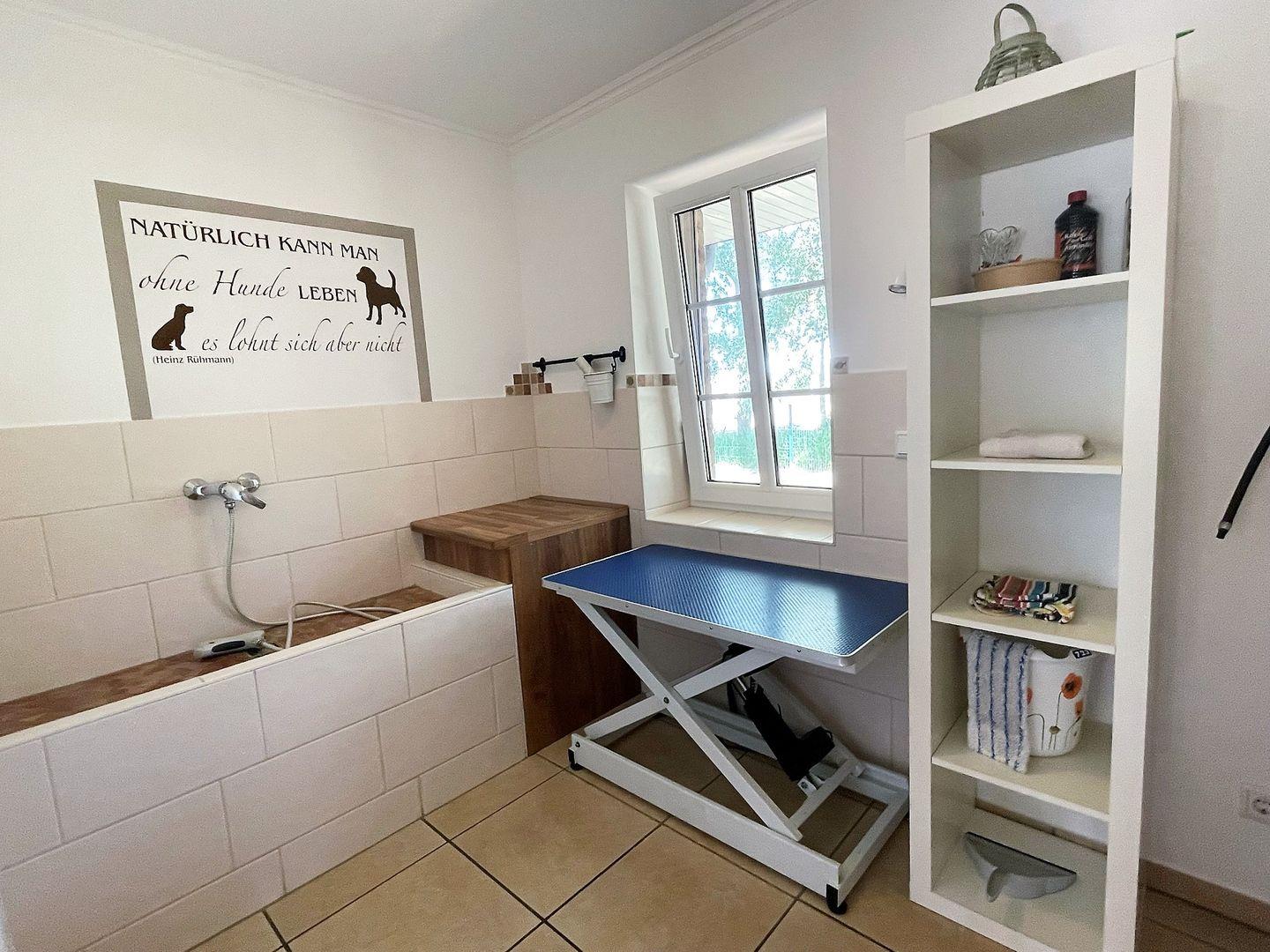 Das Ferienhaus "Lena" bietet auch spezielle Annehmlichkeiten für Hundebesitzer. Ein Wellnessraum für Hunde mit Dusche mit elektrischer Hundehebebühne sowie ein Föhn ermöglicht es Ihnen, Ihren pelzigen Freund nach einem Spaziergang am Strand frisch zu machen.