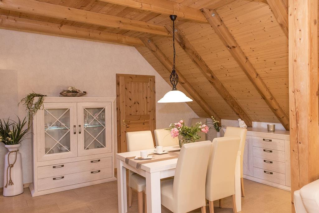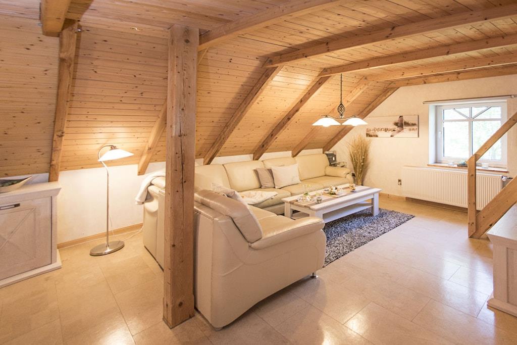 Absolut vollständig ausgestattete Ferienwohnung. Hier beginnt der Urlaub am ersten Tag, ankommen und sich wohl fühlen. Im Landhausstil eingerichtet bietet Ihnen die Ferienwohnung allen Komfort. Die Wohnung verfügt über einen großen Wohnraum mit Esszimmer und offenem Einbauküchenbereich. Die gemütliche Sitzecke lädt zum Entspannen ein. Hier finden Sie neben einem Flachbild-TV auch einen DVD-Player. An die Musikanlage können Sie Ihren eigenen USB-Stick anschließen und so bei angenehmer Musik die Seele baumeln lassen. Die Wohnung ist großteils verfliest, im Wohn-/Essbereich vermittelt ein hochwertiger Korkfußboden angenehme Wohnlichkeit.