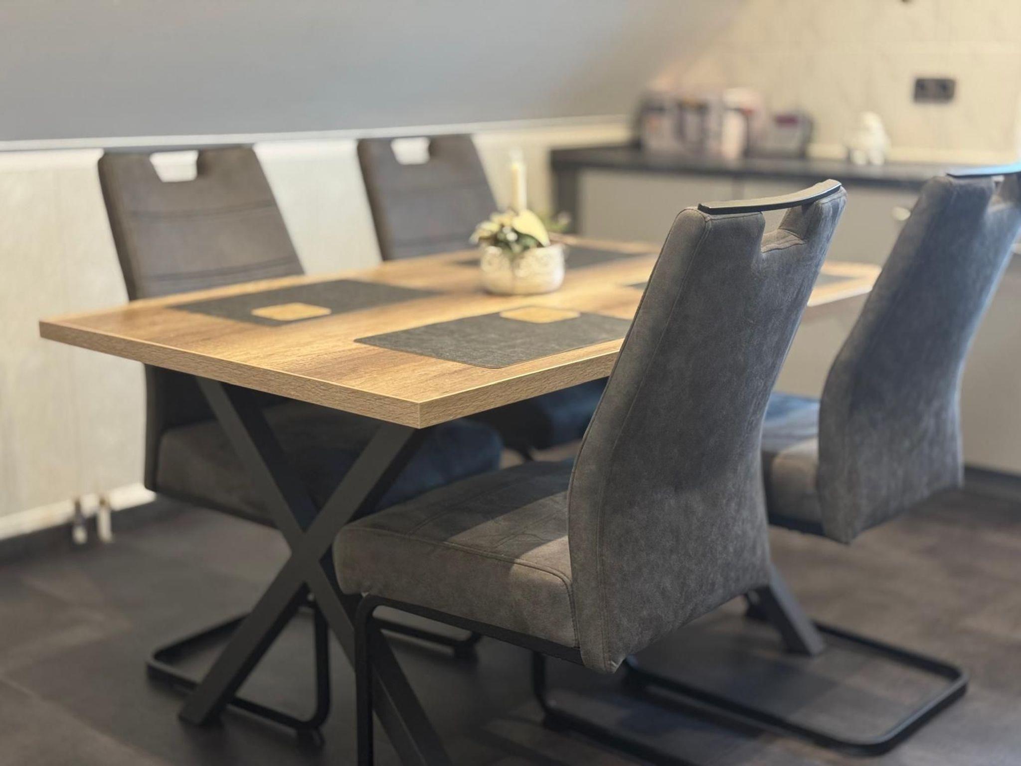 Der große Wohn- und Essbereich ist lichtdurchflutet und hochwertig ausgestattet. Eine komfortable Couch, ein moderner Fernseher und freundliche Holzmöbel schaffen eine warme Atmosphäre. Direkt am Fenster lädt der Blick ins Grüne zum Träumen ein. Am angrenzenden Essbereich finden bis zu vier Personen Platz – perfekt für gemeinsame Mahlzeiten, Spieleabende oder ein gemütliches Frühstück mit Aussicht.