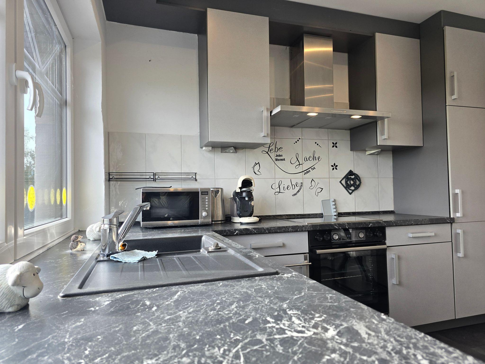 Die separate, helle Küche überzeugt durch ihre klare Linienführung und die vollständige Ausstattung. Hier finden Sie alles, was Sie für einen angenehmen Aufenthalt benötigen – inklusive Cerankochfeld, Backofen, Kaffeemaschine, Mikrowelle und großzügigen Arbeitsflächen. Der große Küchenfensterplatz eröffnet Ihnen auch hier den weitläufigen Blick auf die Felder.