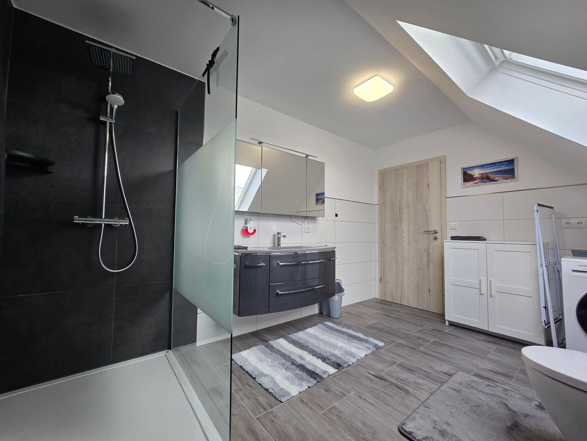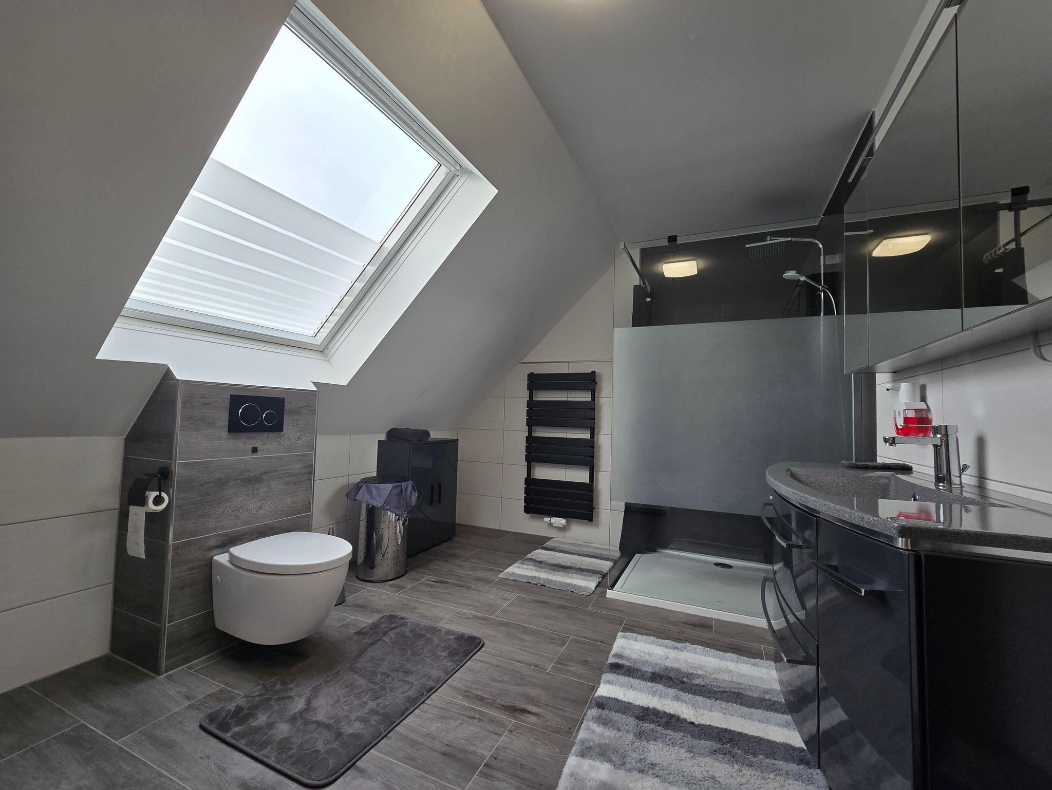 Das moderne Badezimmer bietet viel Platz und Komfort – mit großer bodennaher Dusche, stilvollen Glas- und Holzelementen, großem Dachfenster und zeitloser Fliesengestaltung. Ein separates Gäste-WC erhöht den Wohnkomfort zusätzlich.