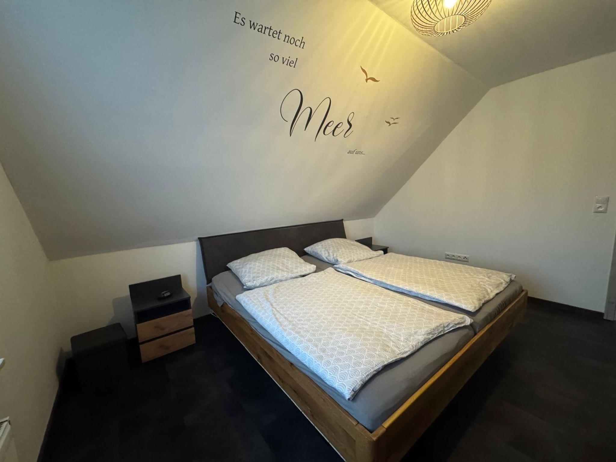 Die Wohnung verfügt über zwei gemütliche Schlafzimmer. Ein Schlafzimmer mit komfortablem Doppelbett, ruhiger Farbgestaltung und stimmungsvollem Wanddesign und ein weiteres Schlafzimmer mit zwei Einzelbetten, ideal für Kinder, Freunde oder zusätzliche Mitreisende.
