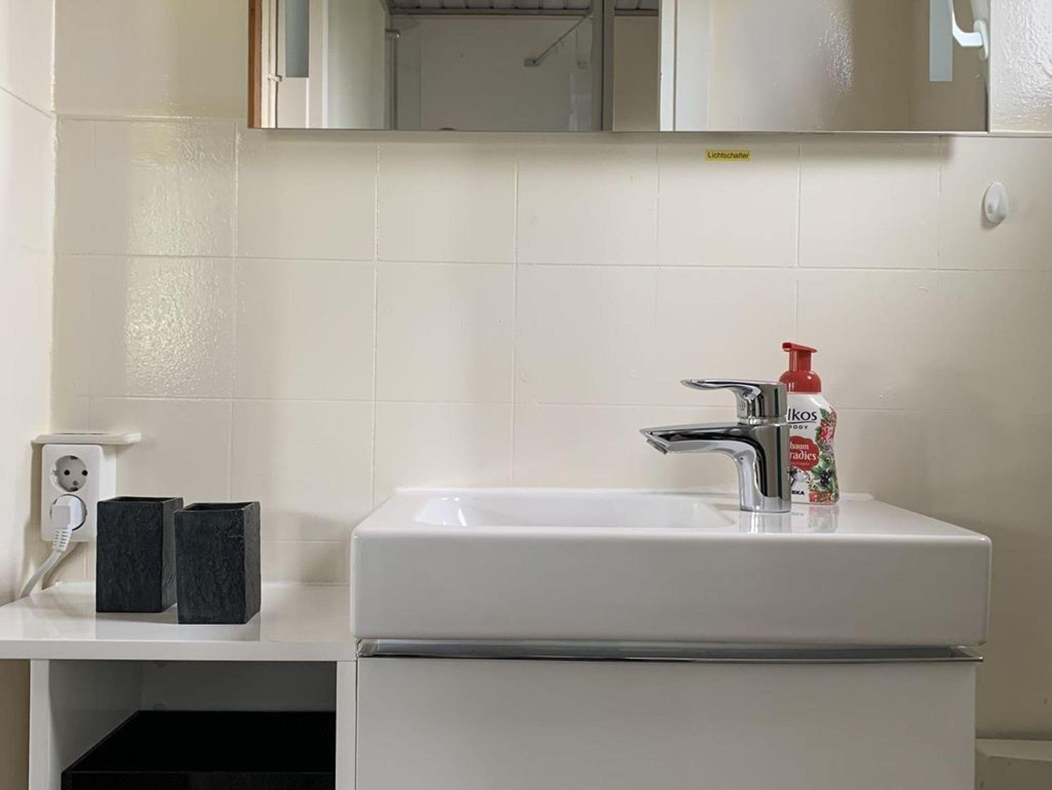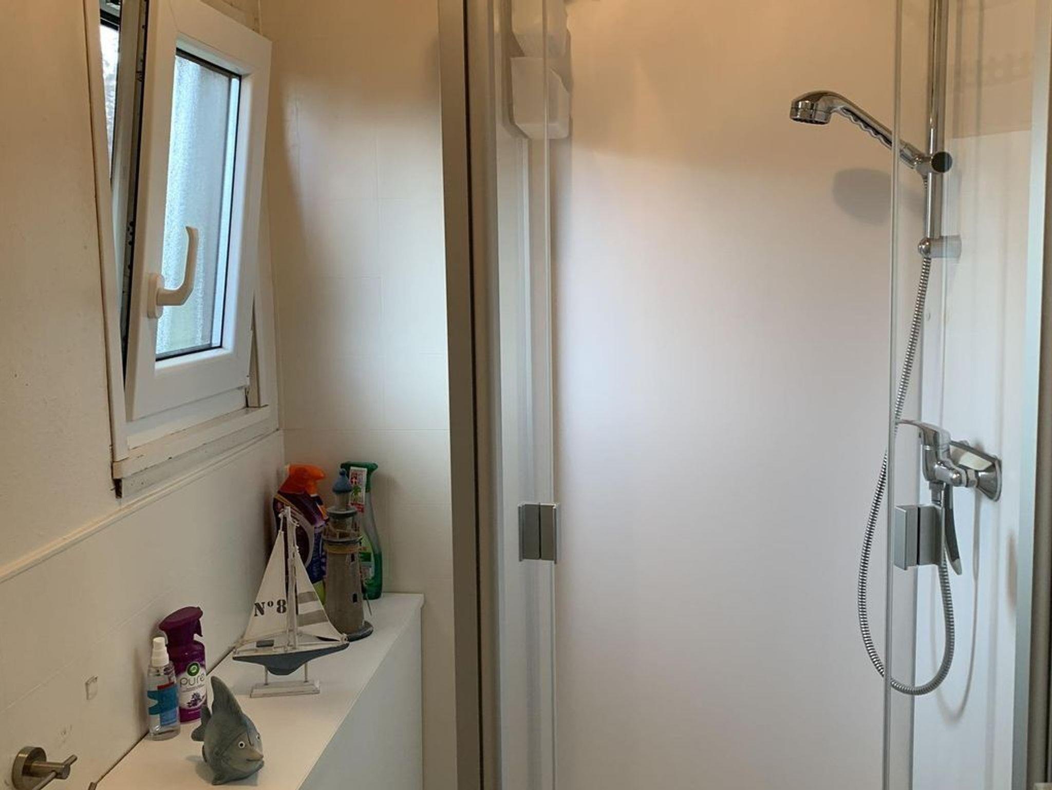 Im Waschraum befinden sich ein praktischer Ablageschrank, ein Waschbecken sowie ein separates WC und eine Dusche.