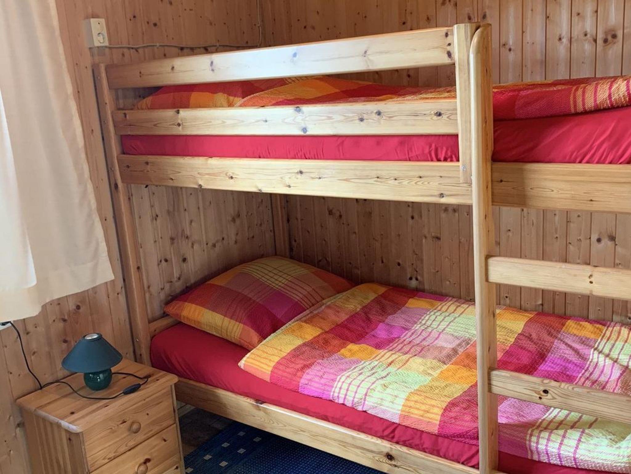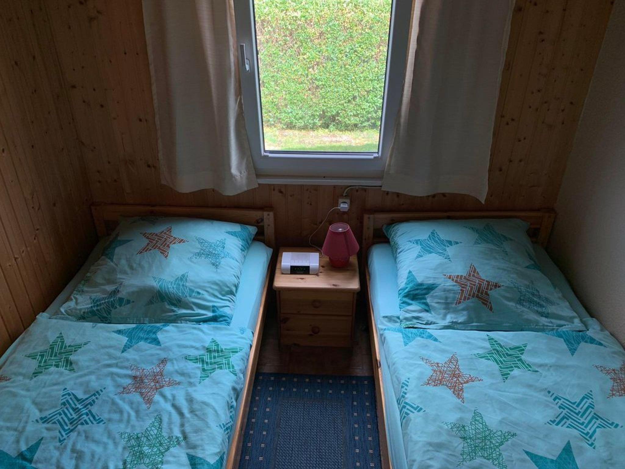Das Haus verfügt über zwei Schlafzimmer: Ein Zimmer ist mit zwei Einzelbetten, einem Nachttisch und einem Radio ausgestattet, während das zweite Zimmer über ein praktisches Etagenbett mit Nachttisch verfügt.