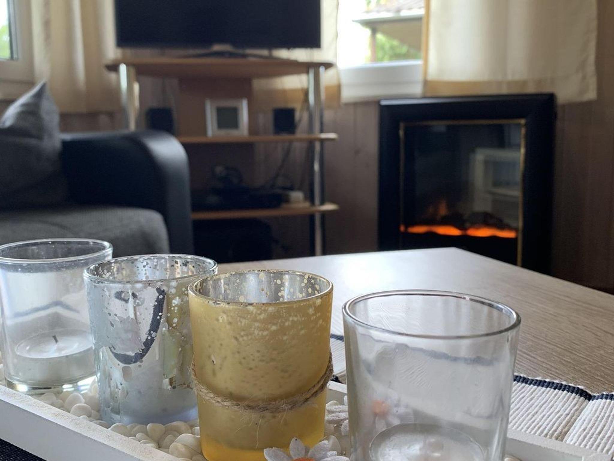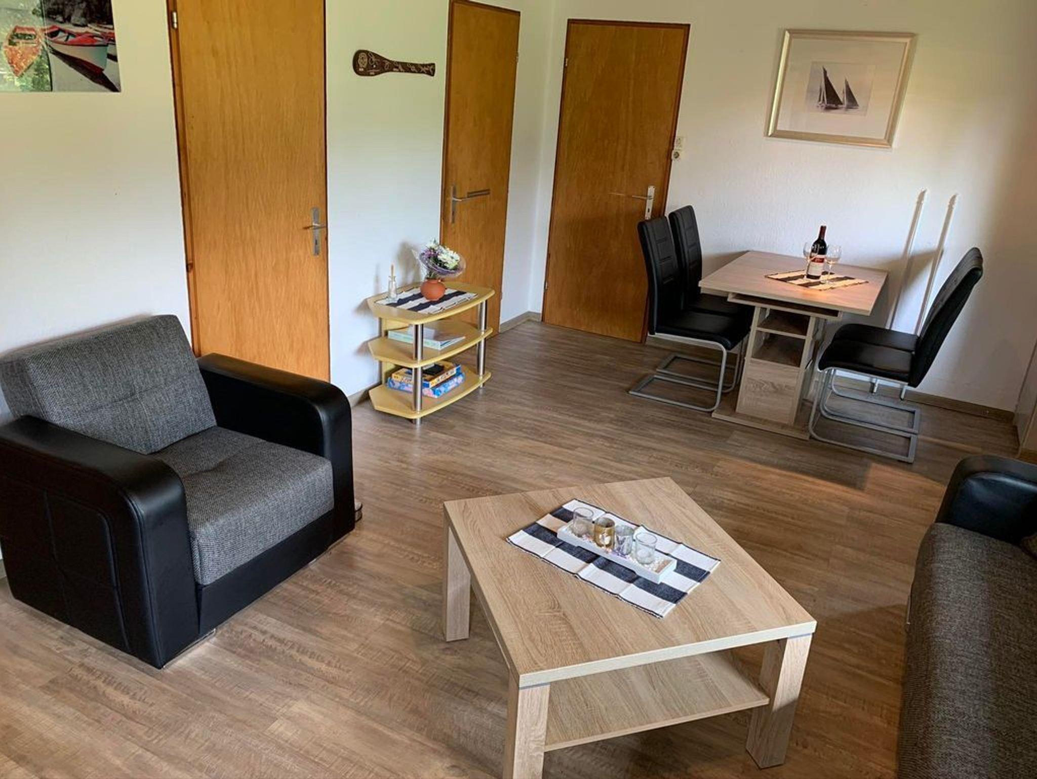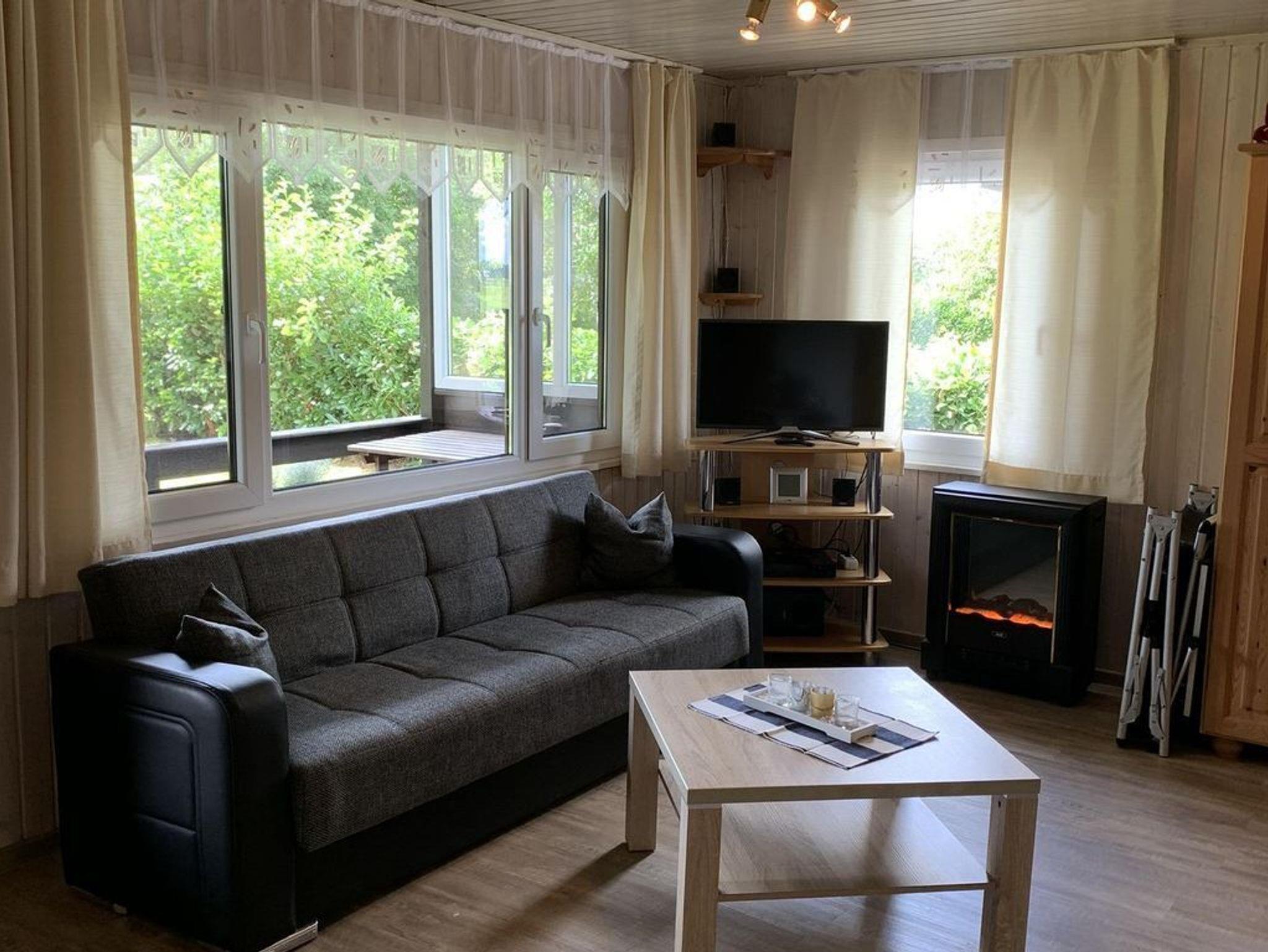 Die Unterkunft bietet ein gemütlich eingerichtetes Wohnzimmer mit einem Kleiderschrank aus Kiefernholz, der über einen Safe verfügt, einer bequemen 3er-Couch, einem Sessel und einem Stubentisch. Zur Unterhaltung stehen ein Sat-TV, ein Radio, ein DVD-Player sowie ein kleiner elektrischer Kaminofen zur Verfügung. Für zusätzliche Wärme sorgen zusätzliche Heizungen. Eine Essgruppe mit einem Ausziehtisch und vier Stühlen lädt zu gemeinsamen Mahlzeiten ein.