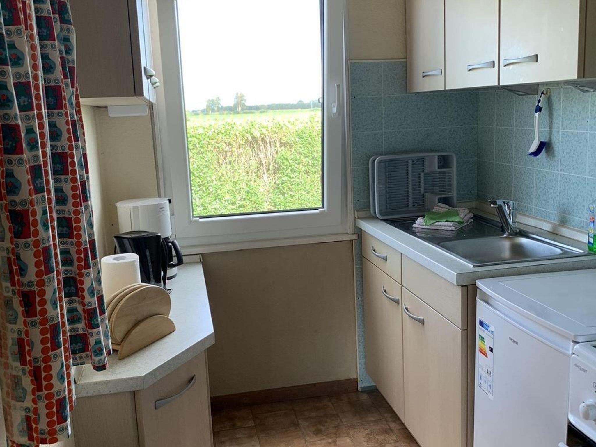 Die voll ausgestattete Einbauküche bietet alles, was Sie für die Zubereitung Ihrer Mahlzeiten benötigen. Dazu gehören ein Elektroherd mit Backofen, eine Spüle, ein Kühlschrank sowie eine Kaffeemaschine, ein Wasserkocher und ein Toaster. Zudem sind sämtliche Kochutensilien wie Töpfe, Pfannen, Geschirr, Gläser und Besteck vorhanden.
