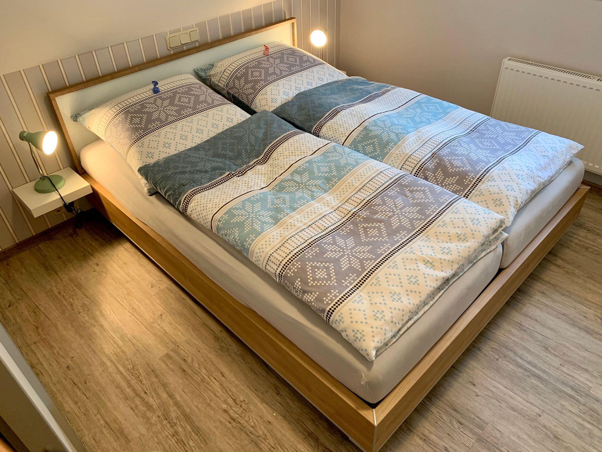 Unsere helle und hochwertig ausgestattete Ferienwohnung im Obergeschoss bietet ausreichend Platz für 2 bis 3 Personen. Für zusätzlichen Komfort ist der Küchen-Wohnbereich mit Fußbodenerwärmung ausgestattet. Auf Wunsch kann für eine dritte Person ein separates Zustellbett bereitgestellt werden.