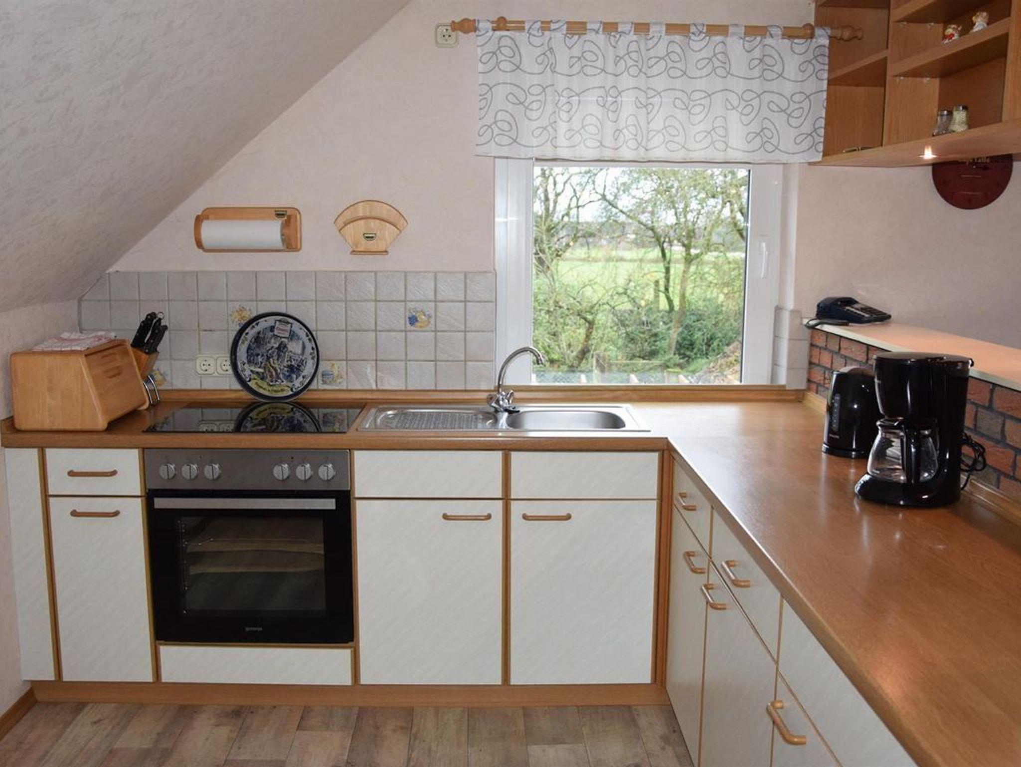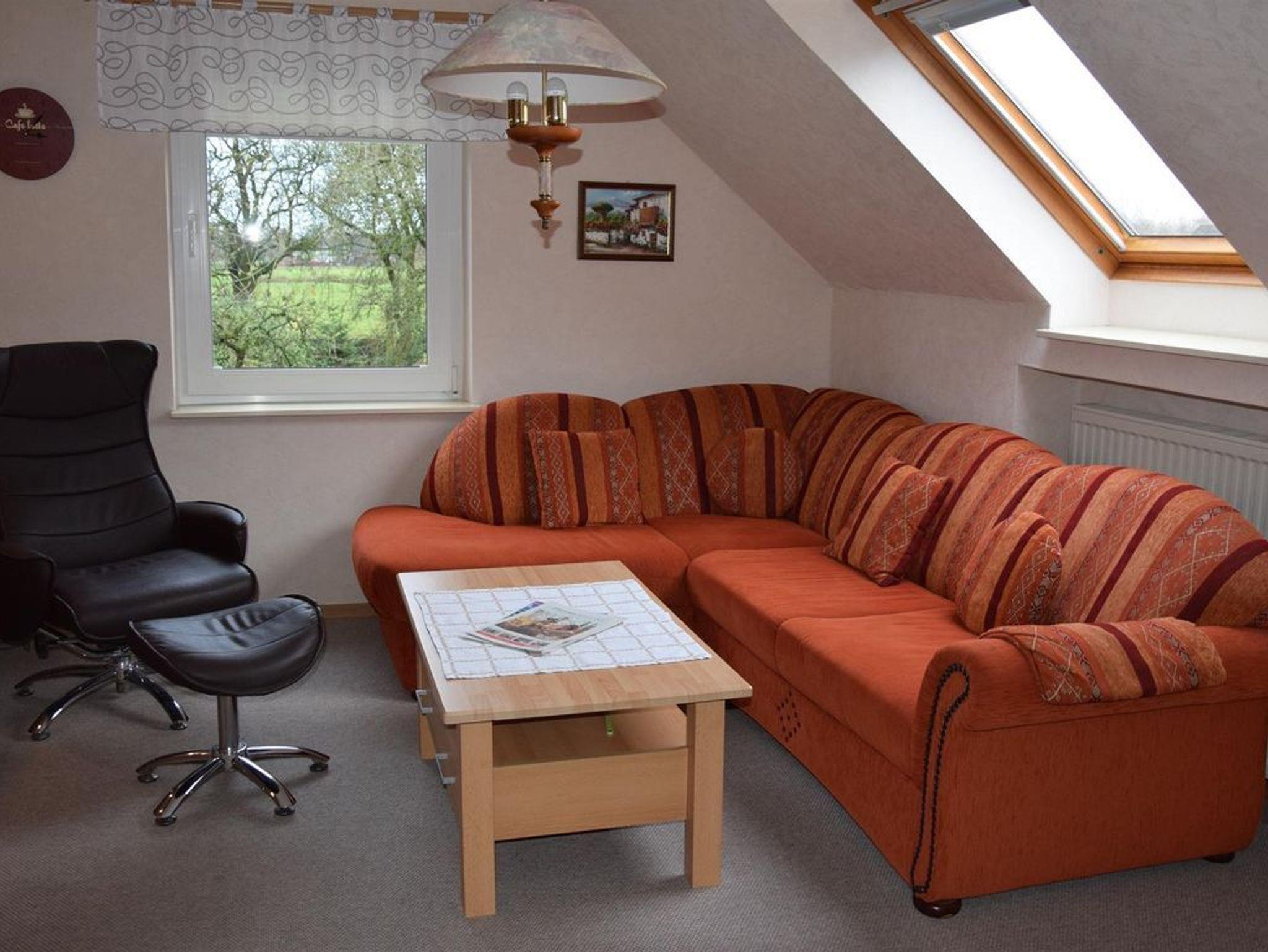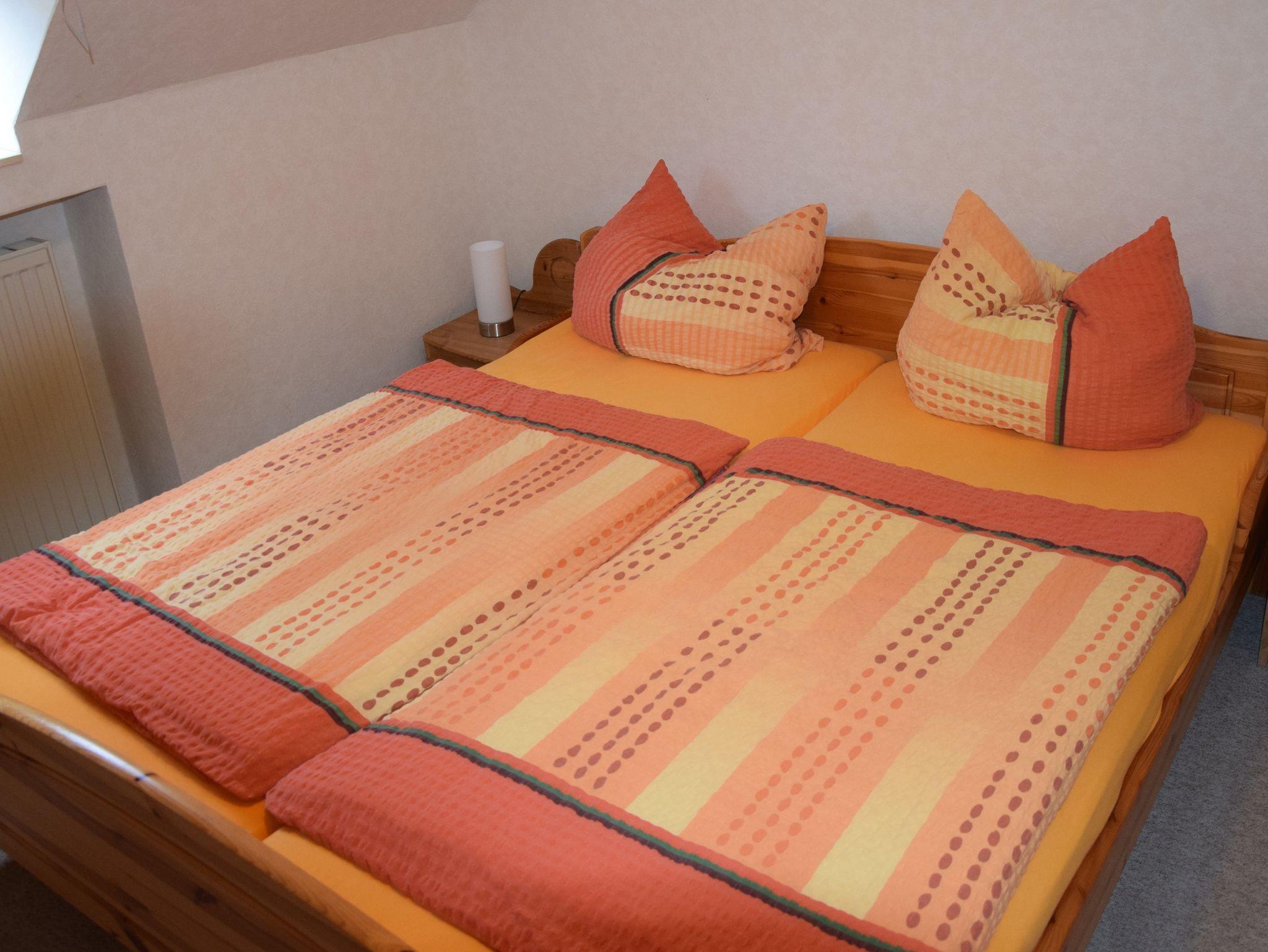 Unsere gemütliche Ferienwohnung im Obergeschoss bietet auf 40 m² Wohnfläche alles, was Sie für einen entspannten Aufenthalt benötigen. Der Küchen- und Wohnbereich besticht durch seine moderne Atmosphäre und ist mit einer komplett ausgestatteten Küchenzeile sowie einem separaten Essplatz versehen. Das Schlafzimmer ist mit Allergikerbetten ausgestattet, und Bettwäsche kann gegen eine geringe Gebühr hinzugebucht werden. Das Badezimmer verfügt über eine Dusche und WC. Im Wohnzimmer mit SAT-TV können Sie entspannen, während der Ausblick aus dem Fenster die freie Natur offenbart. Eine gemütliche Sitzecke lädt zudem zum Verweilen und Genießen der Umgebung ein.