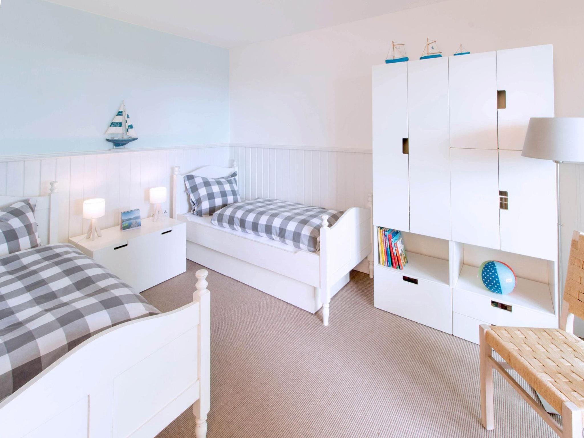 Das Ferienhaus verfügt über zwei Schlafräume, die erholsame Nächte garantieren. Ein Schlafzimmer ist mit einem großzügigen Hochbett (180 cm x 220 cm) ausgestattet, das zweite bietet zwei Einzelbetten (90 cm x 200 cm). Zusätzlich lässt sich das Sofa im Wohnzimmer zu einem Bett ausklappen ideal für zusätzliche Gäste.